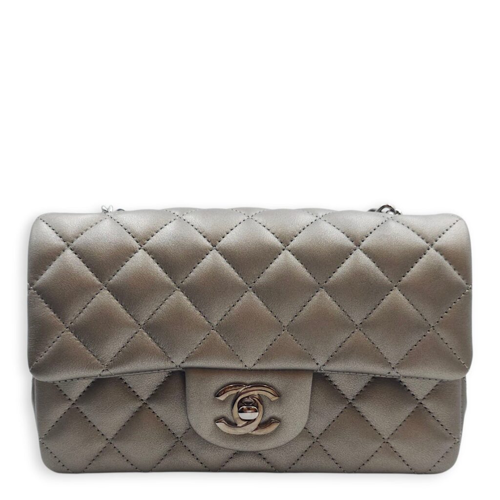 Quilted Rectangular Mini Grey Flap Bag in Lambskin, Silver hardware