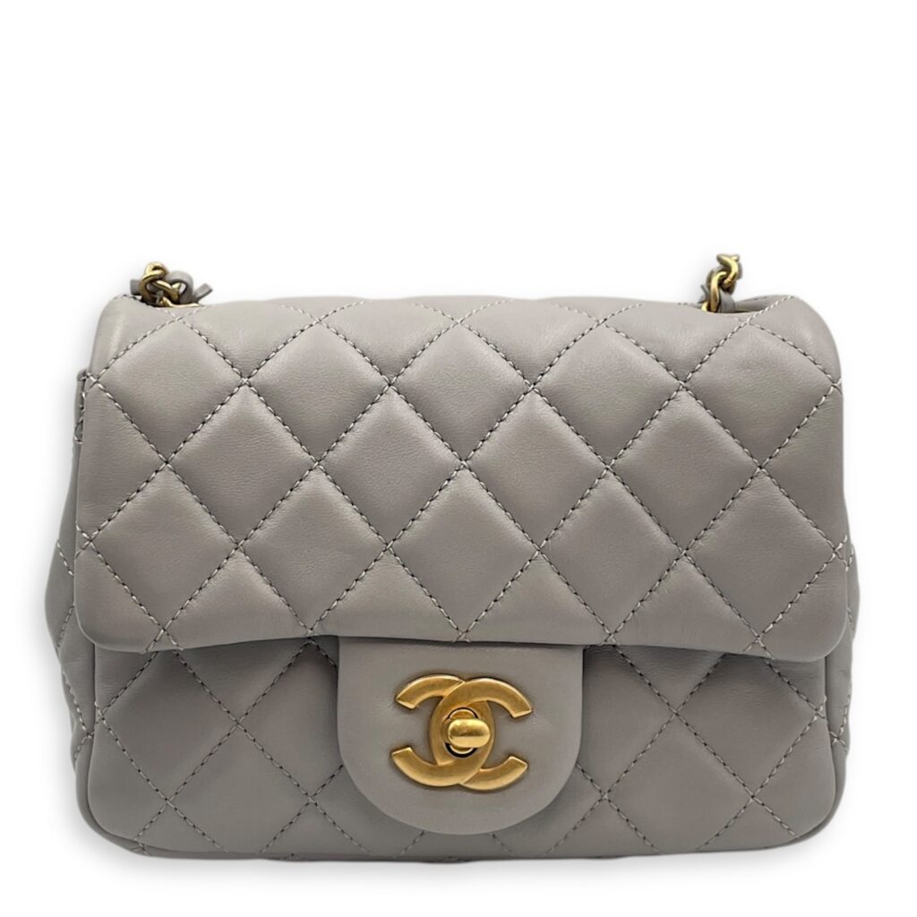 Quilted Pearl Crush Square Mini Grey Flap Bag with Adjustable Chain Strap in Lambskin, Brushed Gold hardware