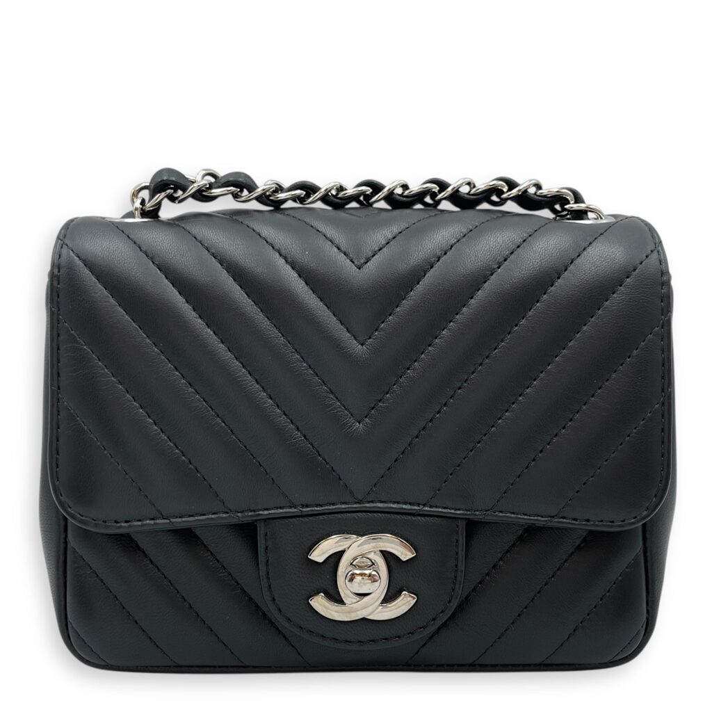 Square Chevron Mini Black Flap Bag in Lambskin, Silver hardware