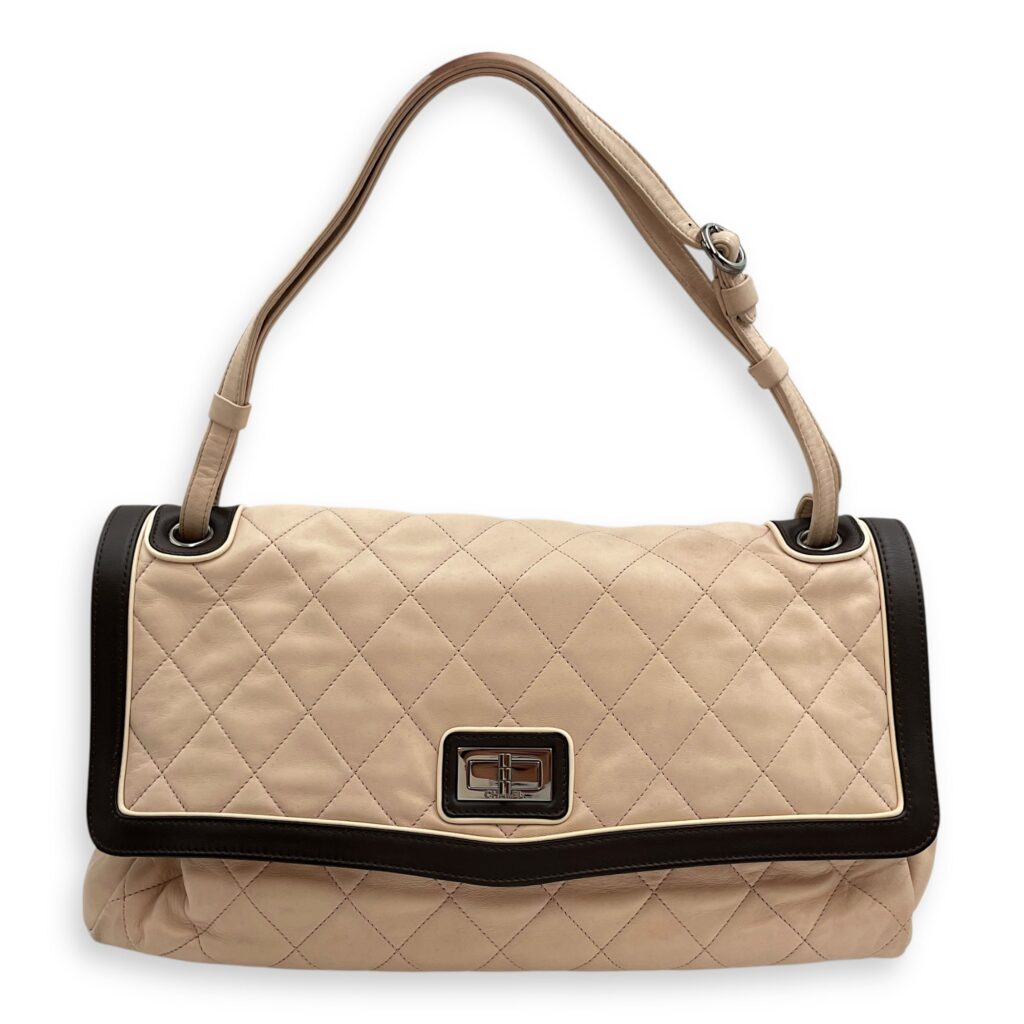 Two Tone Mademoiselle Lock Flap Beige Sholder bag in Lambskin, Silver hardware