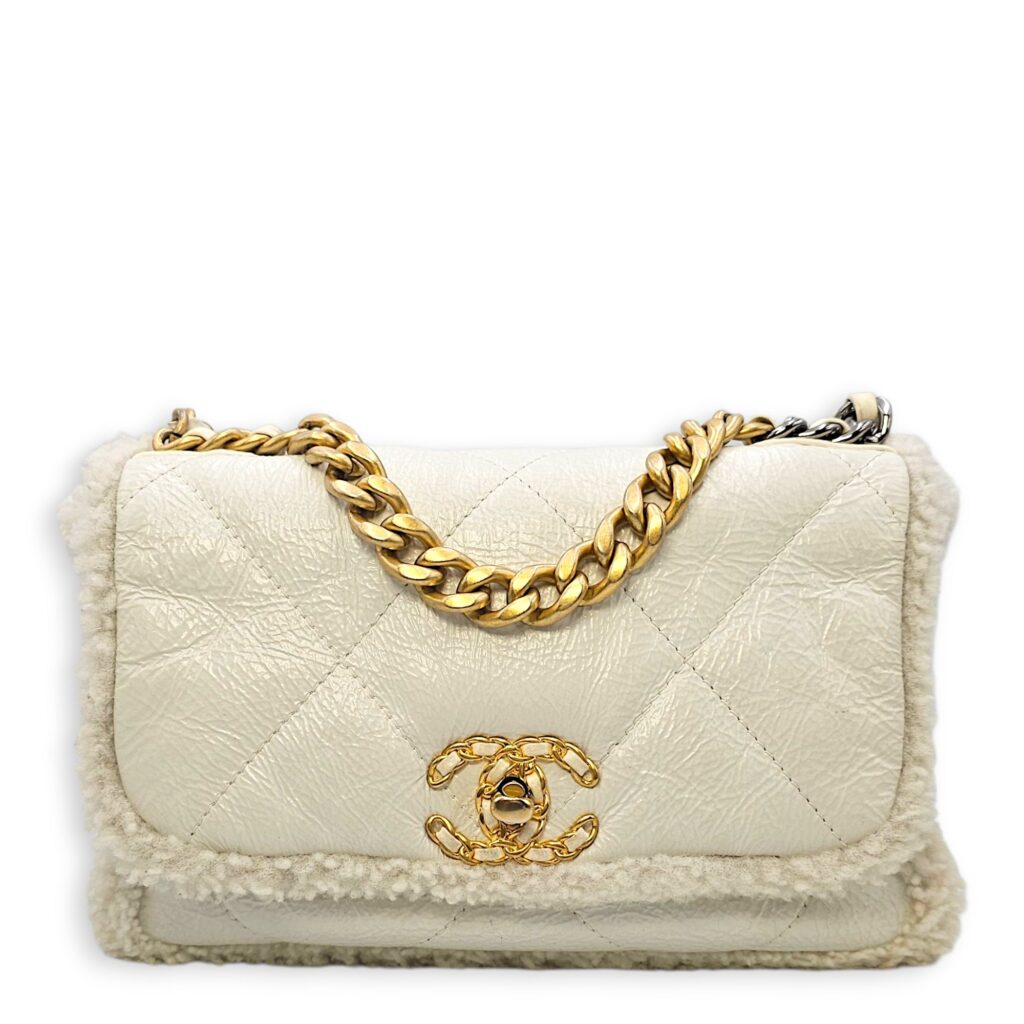 C19 Flap White Shoulder Bag in Shiny Calf & Shearling, Gold & Silver hardware
