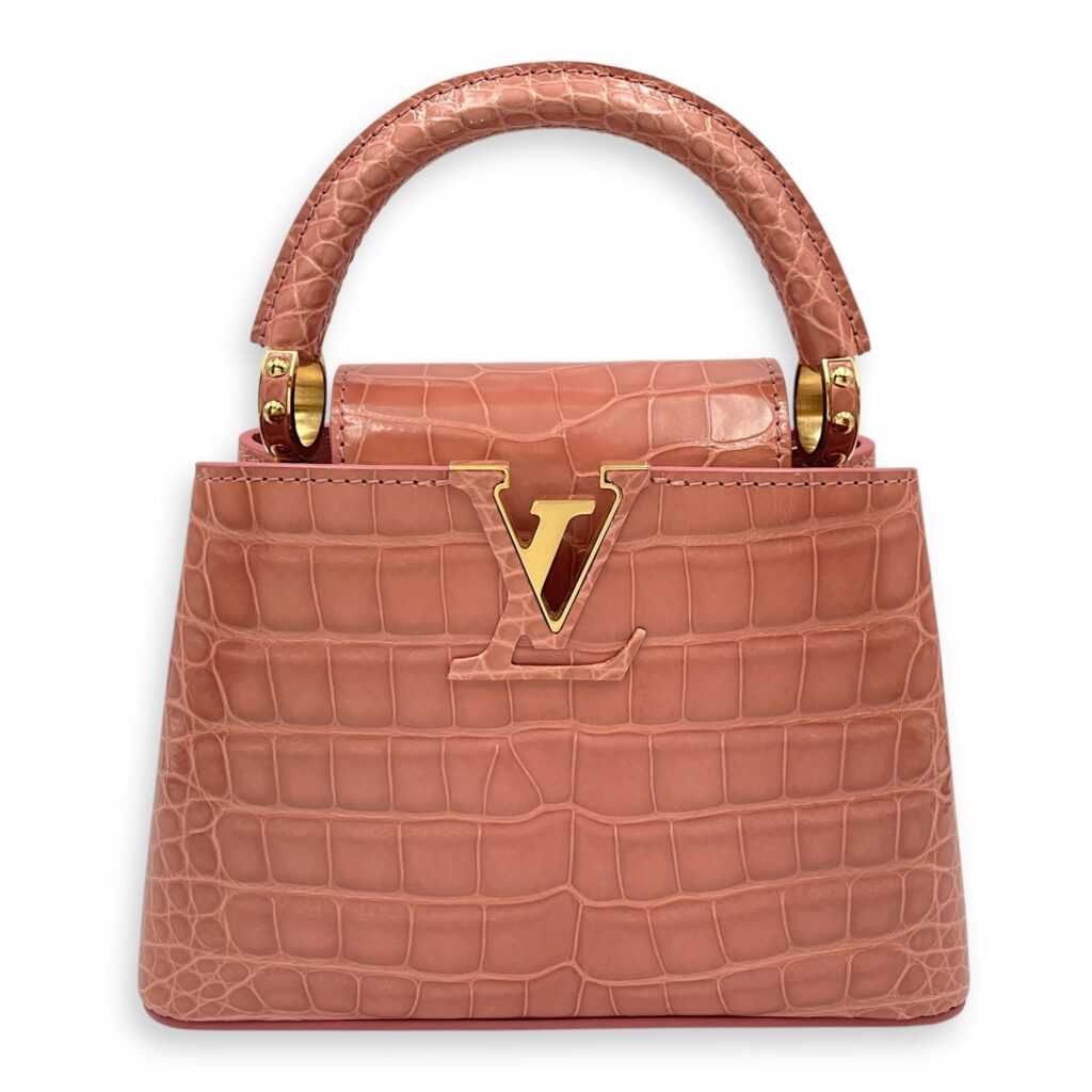 Capucines Mini Pink Shoulder Bag in Shiny Alligator, Gold hardware