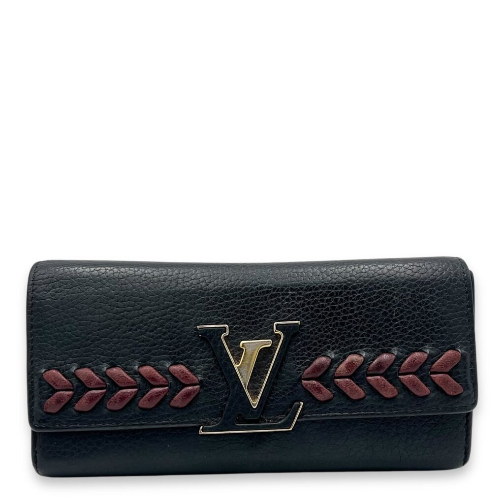 Capucines Long Black Wallet in Calfskin, Gold hardware