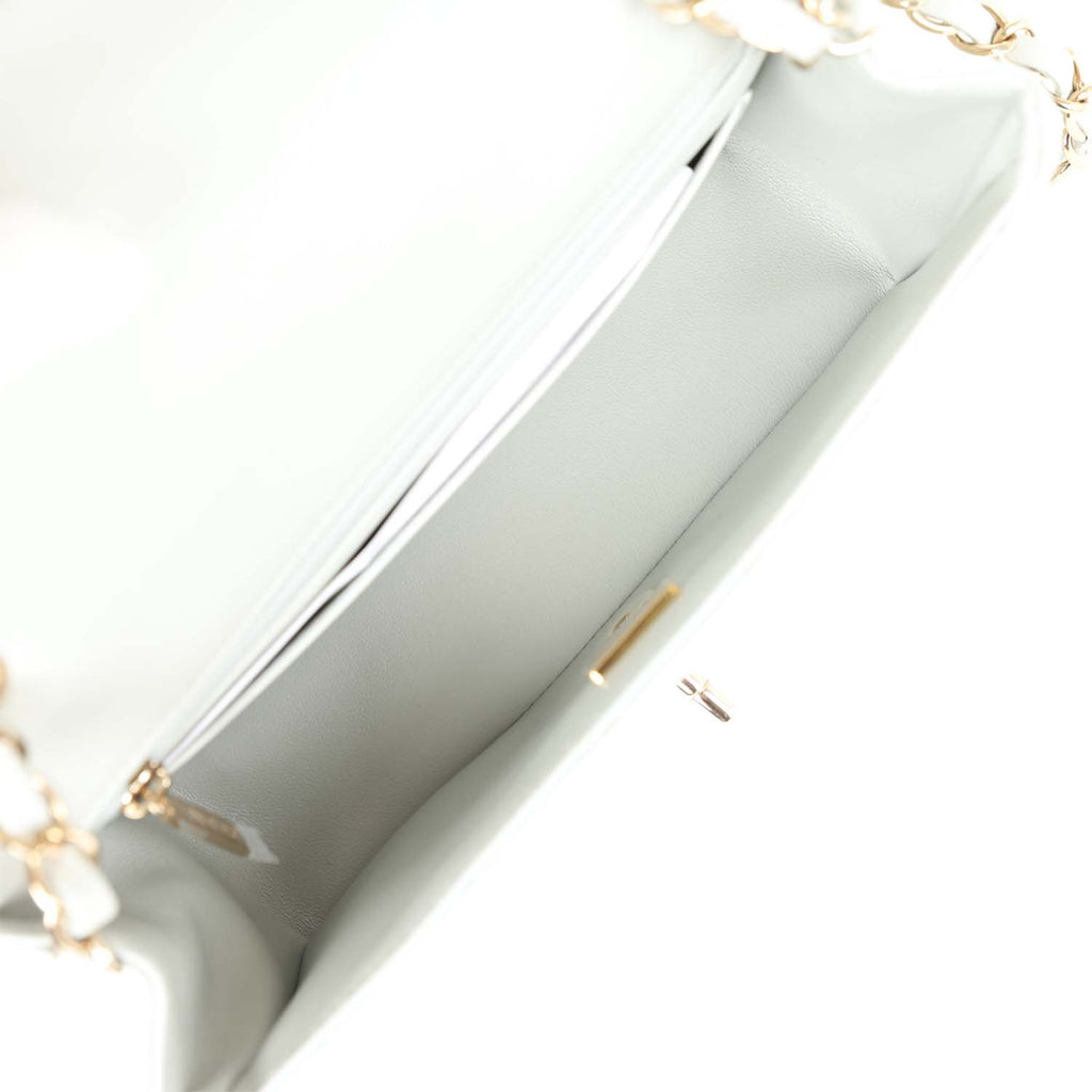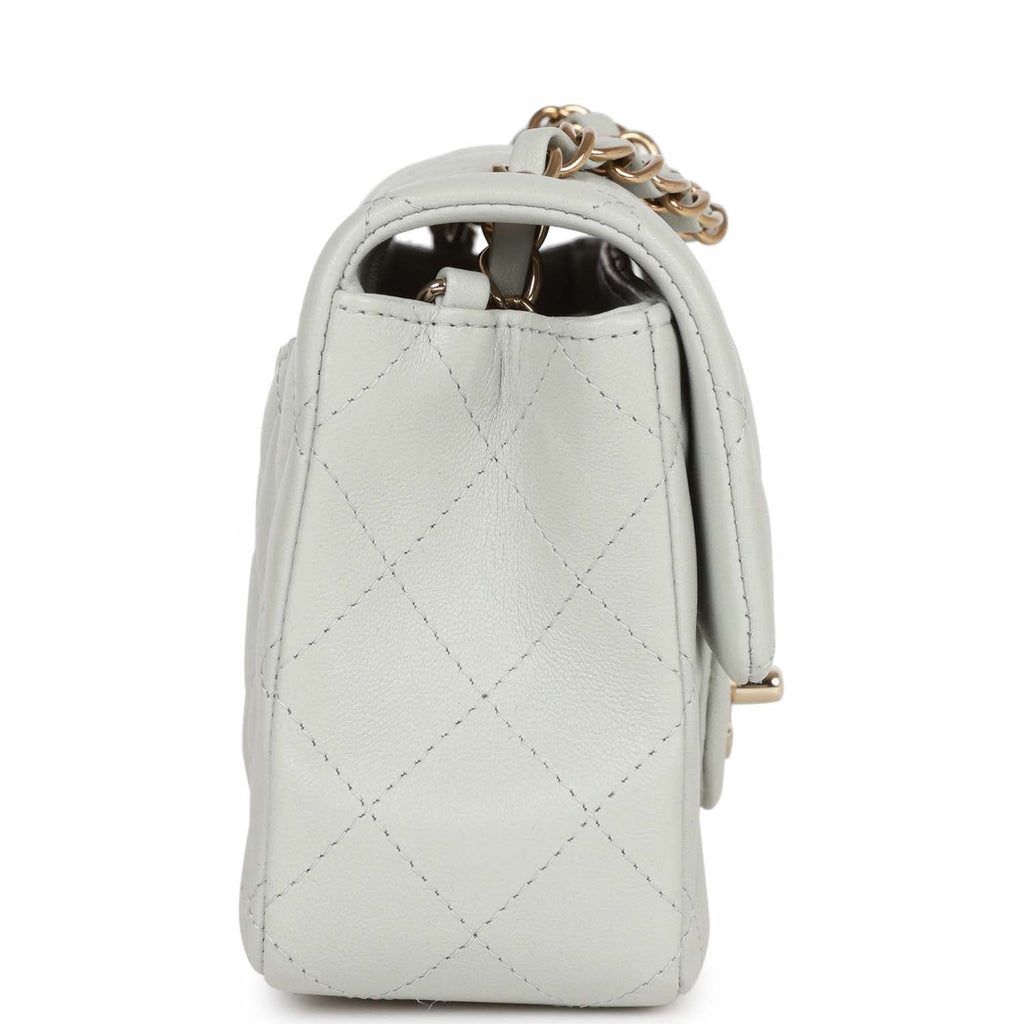 Chanel Mini Rectangular Flap Bag Light Grey Lambskin Light Gold Hardware Shop for an authentic Chanel Mini Rectangular Flap bag in light grey lambskin with light gold hardware in new and never worn condition at Madison Avenue Couture.