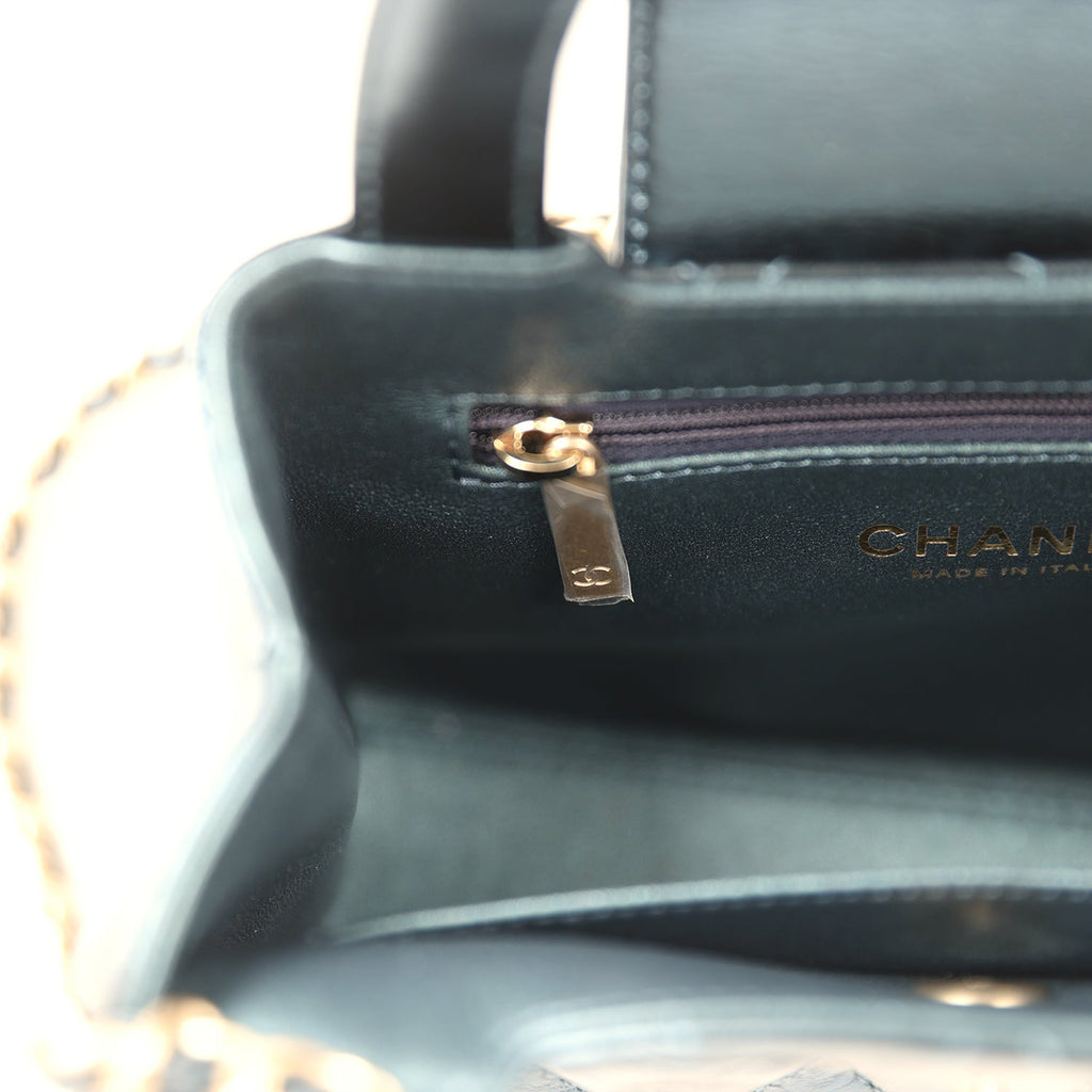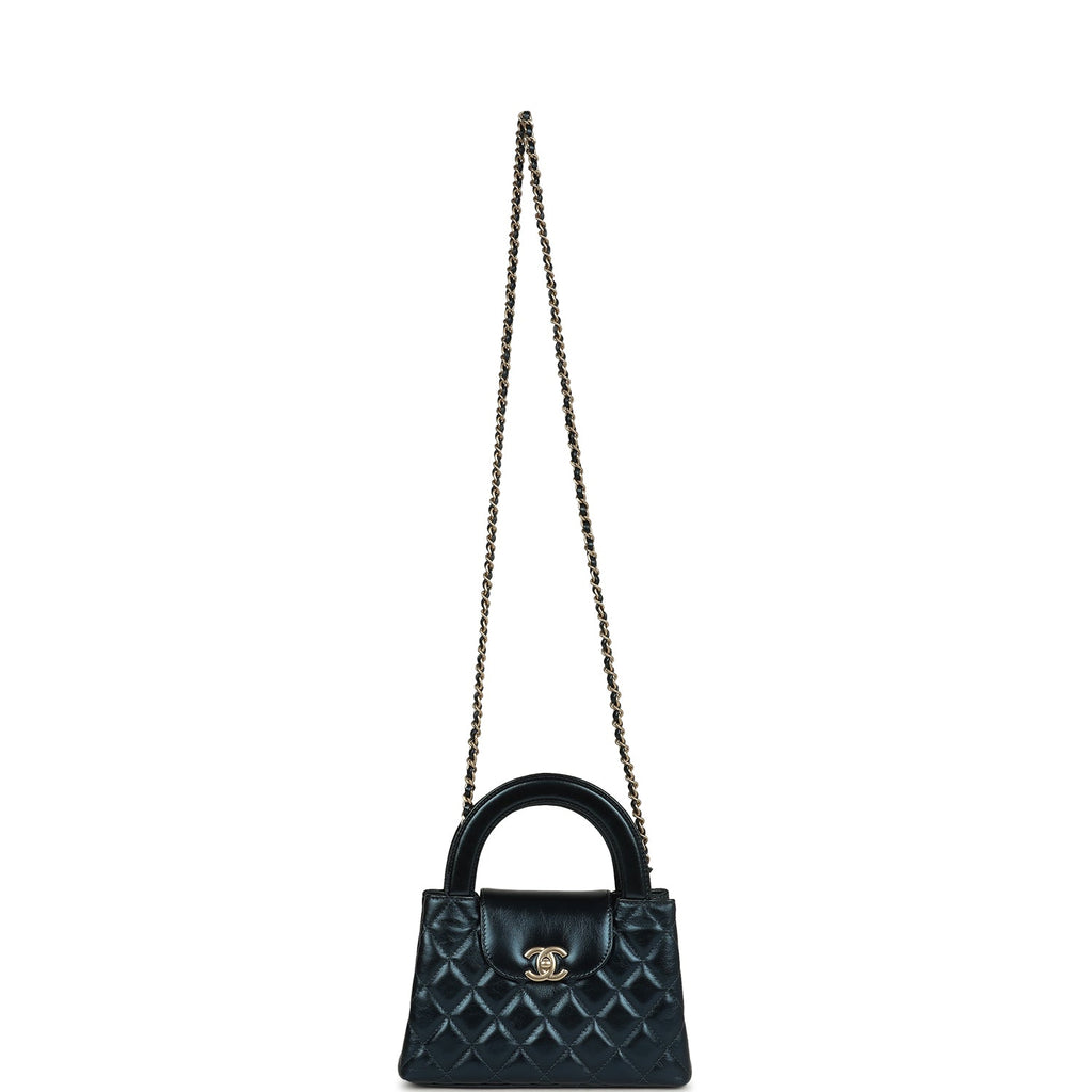 Chanel Small Kelly Shopper Metallic Blue Calfskin Brushed Gold Hardware Shop for an authentic Chanel Small Kelly Shopper in metallic blue calfskin with brushed gold hardware in new and never worn condition at Madison Avenue Couture.