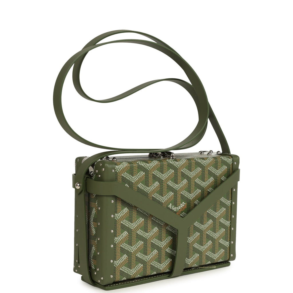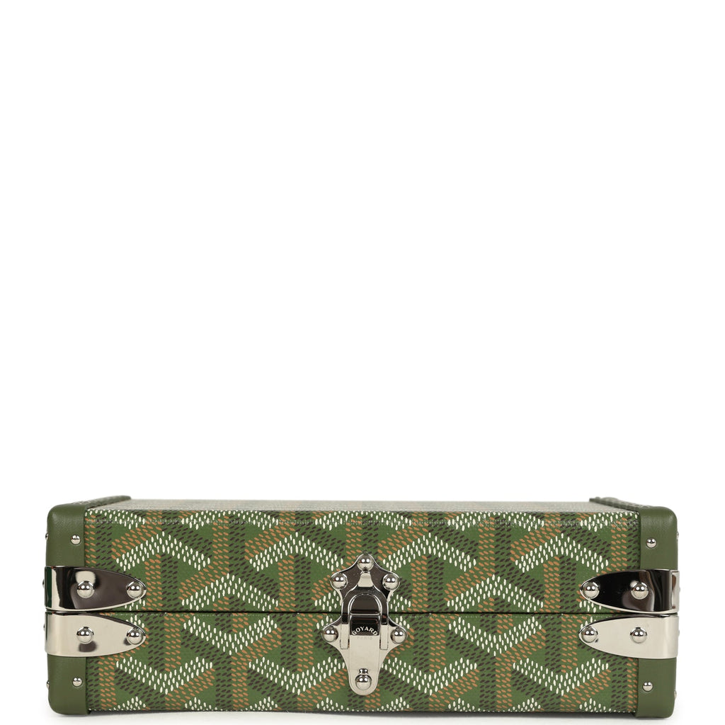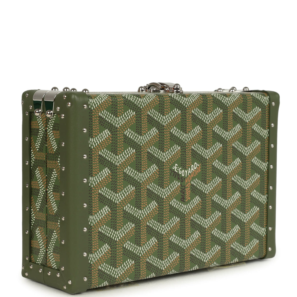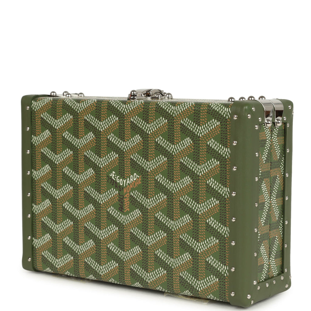 Goyard Goyardine Canvas Khaki Minaudière Trunk Bag Palladium Hardware Shop for an authentic Goyard Minaudière Trunk Bag in Khaki canvas Goyardine with palladium hardware in new and never worn condition at Madison Avenue Couture.
