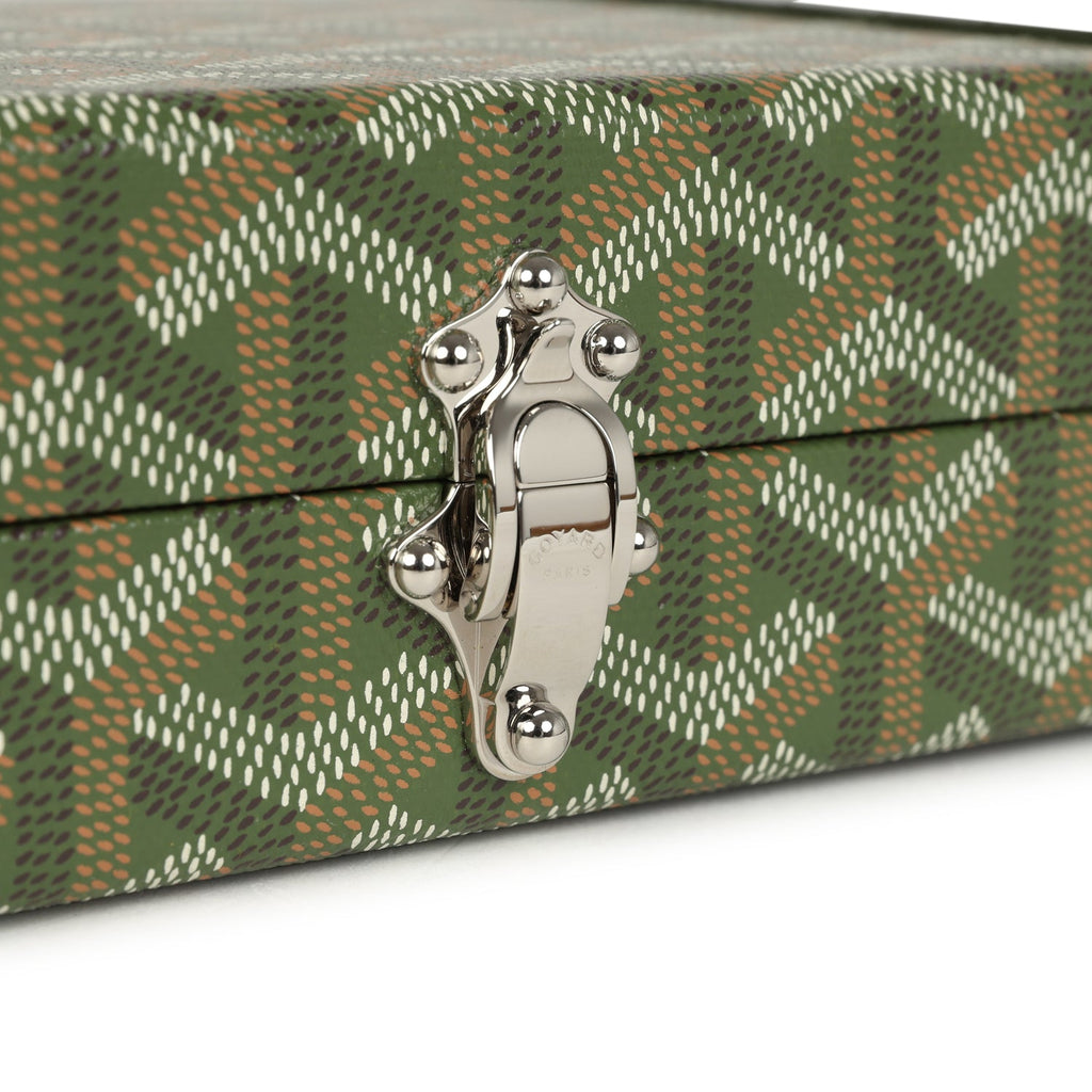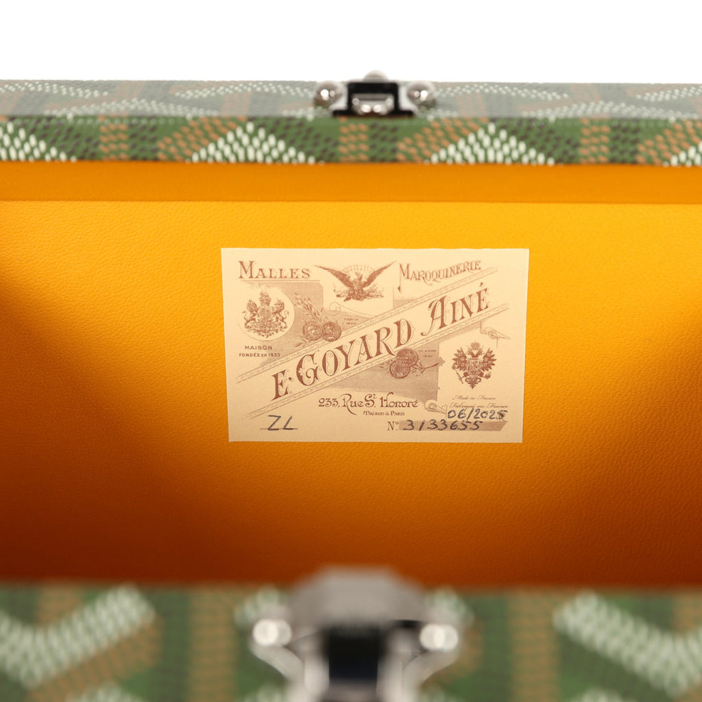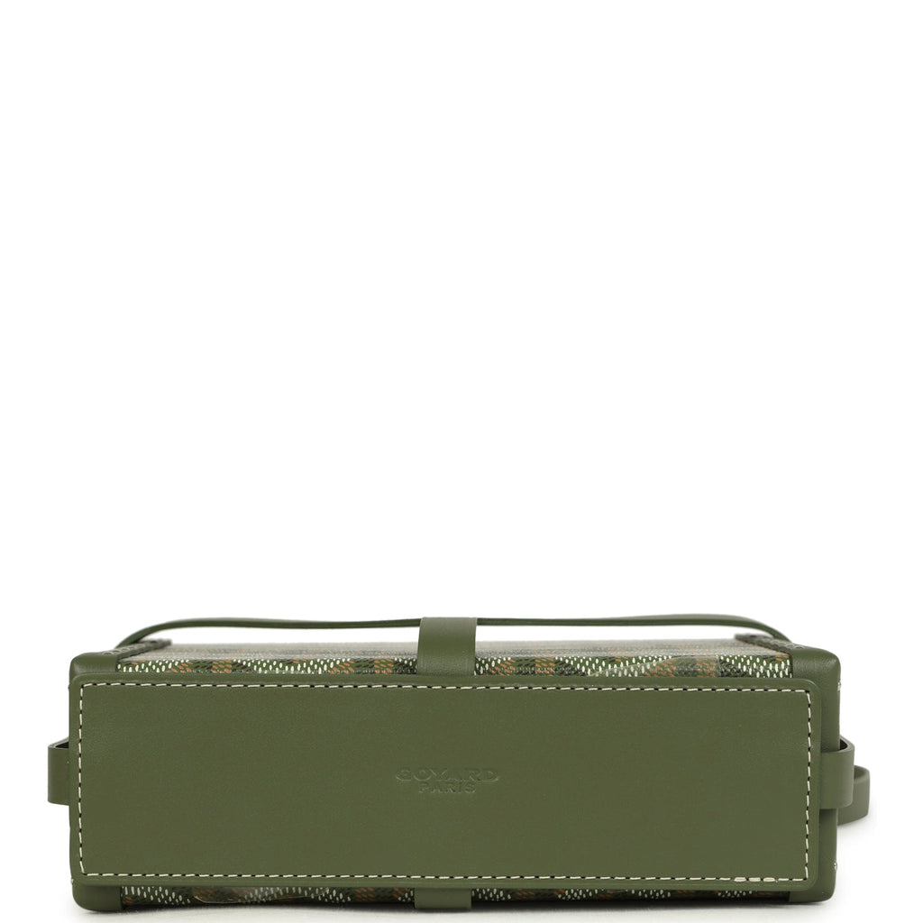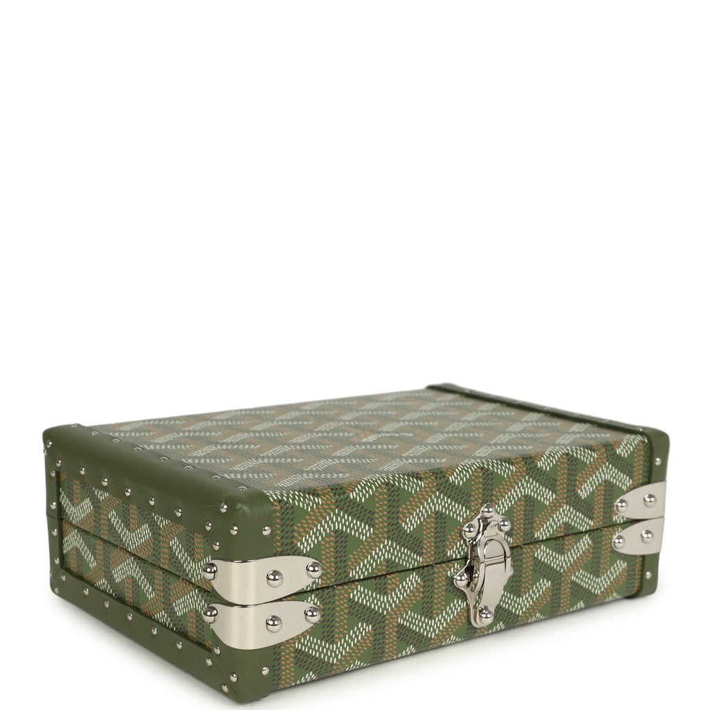 Goyard Goyardine Canvas Khaki Minaudière Trunk Bag Palladium Hardware Shop for an authentic Goyard Minaudière Trunk Bag in Khaki canvas Goyardine with palladium hardware in new and never worn condition at Madison Avenue Couture.