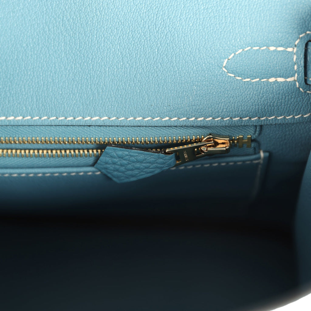 This Birkin is in Blue Jean togo leather with gold hardware and has contrast stitching, a front flap, two straps with center toggle closure, clochette with lock and two keys, and double rolled handles.The interior is lined with Blue Jean chevre, has one zip pocket with an Hermes engraved zipper pull and an open pocket on the opposite side.Collection: W (2024)Origin: FranceCondition: New and never worn (plastic on hardware)Accompanied by: Hermes box (no tissue), Hermes dustbag, clochette, clochette dustbag, lock, two keys, carebookMeasurements: 10″ width x 7.5″ height x 4.75″ depth; 2.75″ handle drop