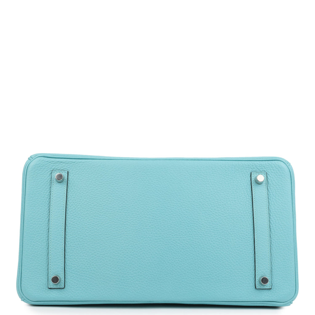 Hermes Birkin 35 Bleu Atoll Clemence Palladium Hardware Shop for an authentic Hermes Birkin 35 Bleu Atoll clemence leather with gold hardware in never worn condition at Madison Avenue Couture.