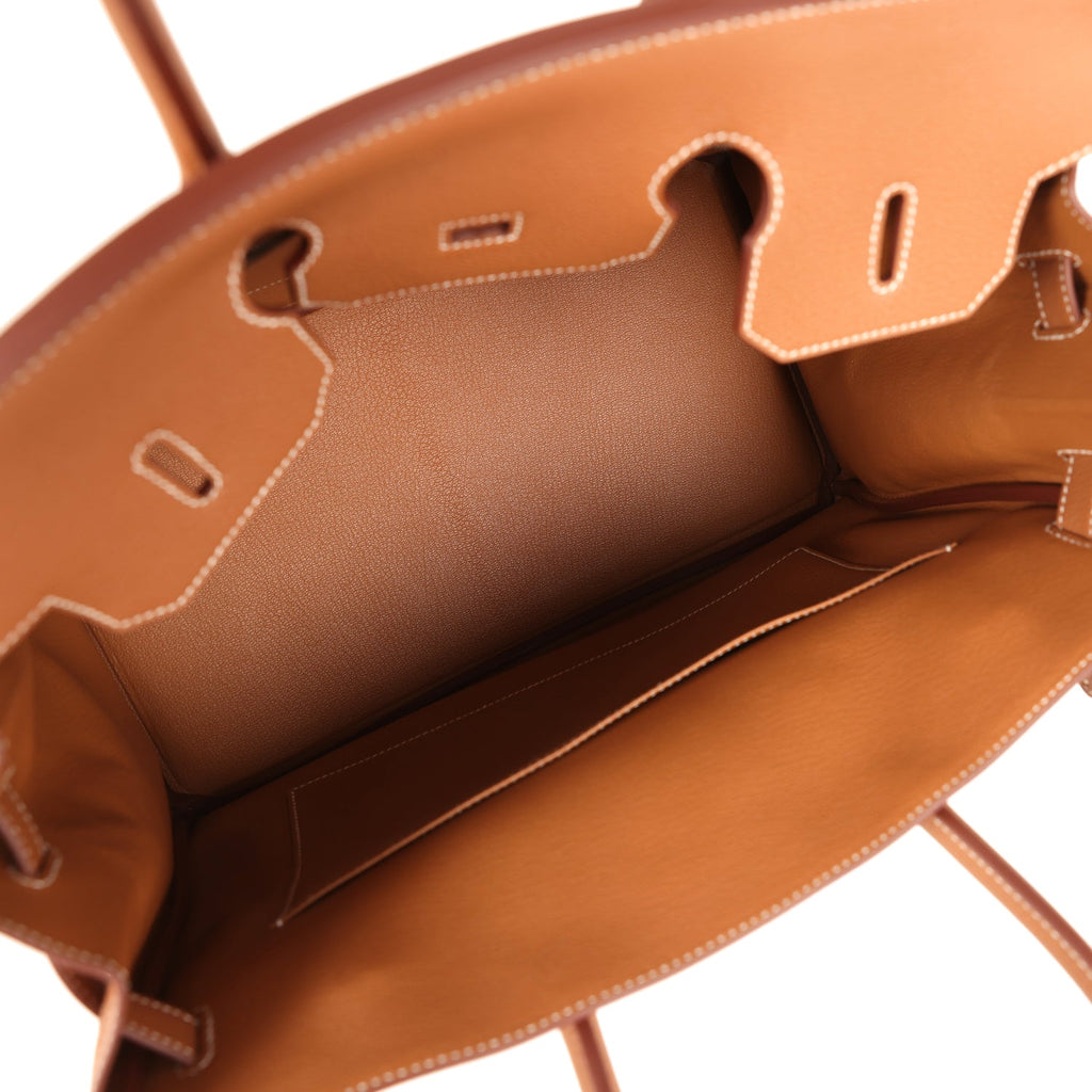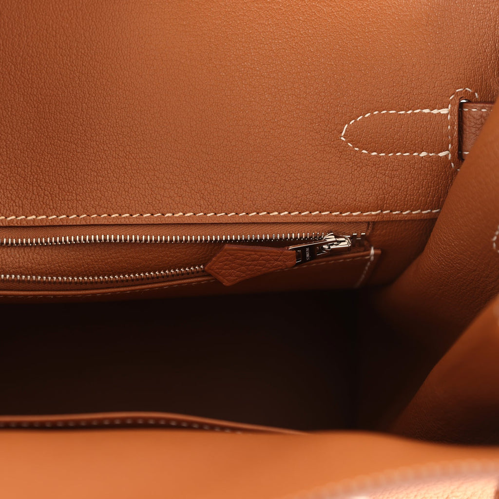 This Birkin is in Gold togo leather with palladium hardware and has contrast stitching, two straps with front toggle closure, clochette with lock and two keys and double rolled handles.The interior is lined with Gold chevre and has one zip pocket with an Hermes engraved zipper pull and an open pocket on the opposite side.Collection: K (2025) Origin: FranceCondition: New and never worn (plastic on hardware)Accompanied by: Hermes box (minor cosmetic damage to lid), Hermes dustbag, felt, clochette, lock, two keys, clochette dustbag, carebook, ribbonMeasurements: 13.75″ width x 11″ height x 7″ depth; 4.25″ handle drop