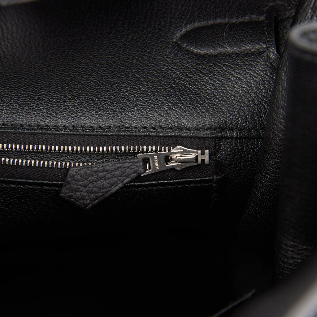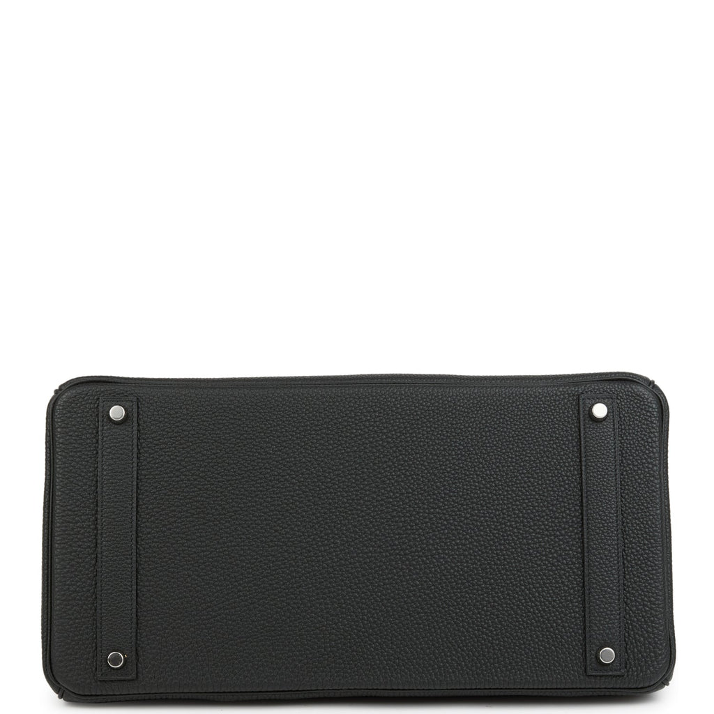 This Birkin is in Black togo leather with palladium hardware and has tonal stitching, two straps with front toggle closure, clochette with lock and two keys and double rolled handles.The interior is lined in Black chevre with one zip pocket with an Hermes engraved zipper pull and an open pocket on the opposite side.Collection: U (2022)Origin: FranceCondition: New and never worn (plastic on hardware)Accompanied by:  Hermes box, Hermes dustbag, felt, clochette, lock, two keys, clochette dustbag, carebook, rainhatMeasurements: 15.75″ width x 12.75″ height x 8″ depth; 4.25″ handle drop