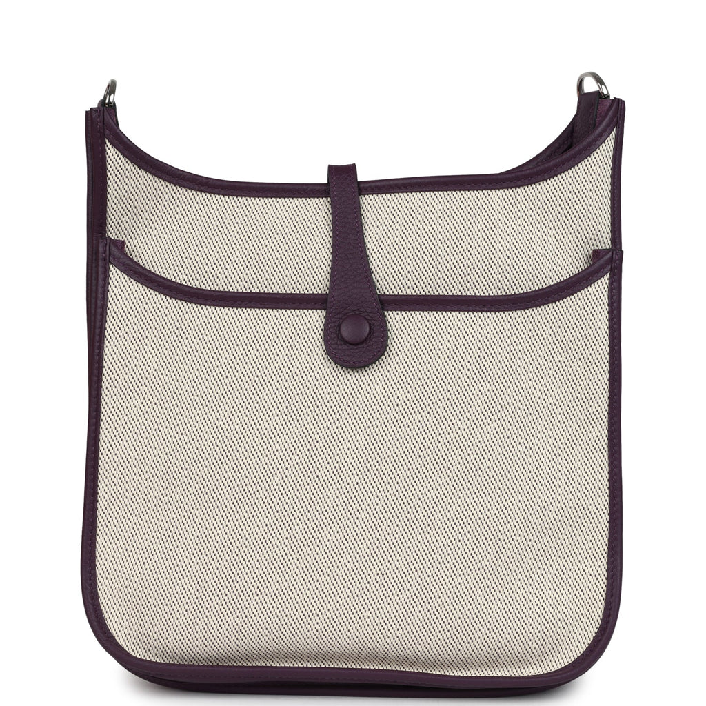 Hermes Evelyne III PM Cassis Clemence and Ecru Toile H Palladium Hardware Shop for an authentic Hermes Evelyne PM Cassis Clemence and Ecru Toile H with palladium hardware in new and never worn condition at Madison Avenue Couture.