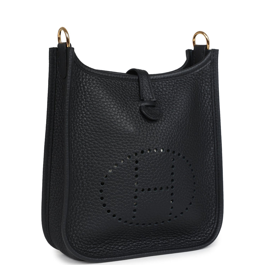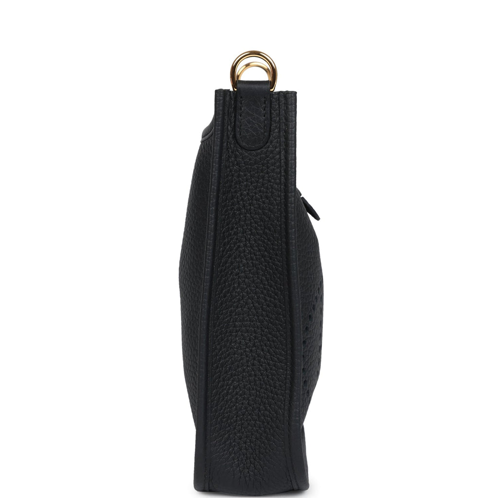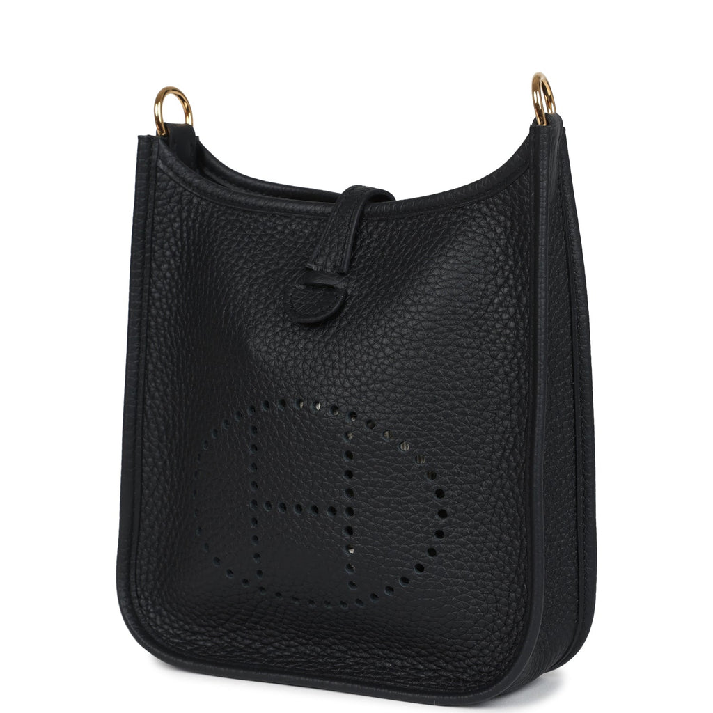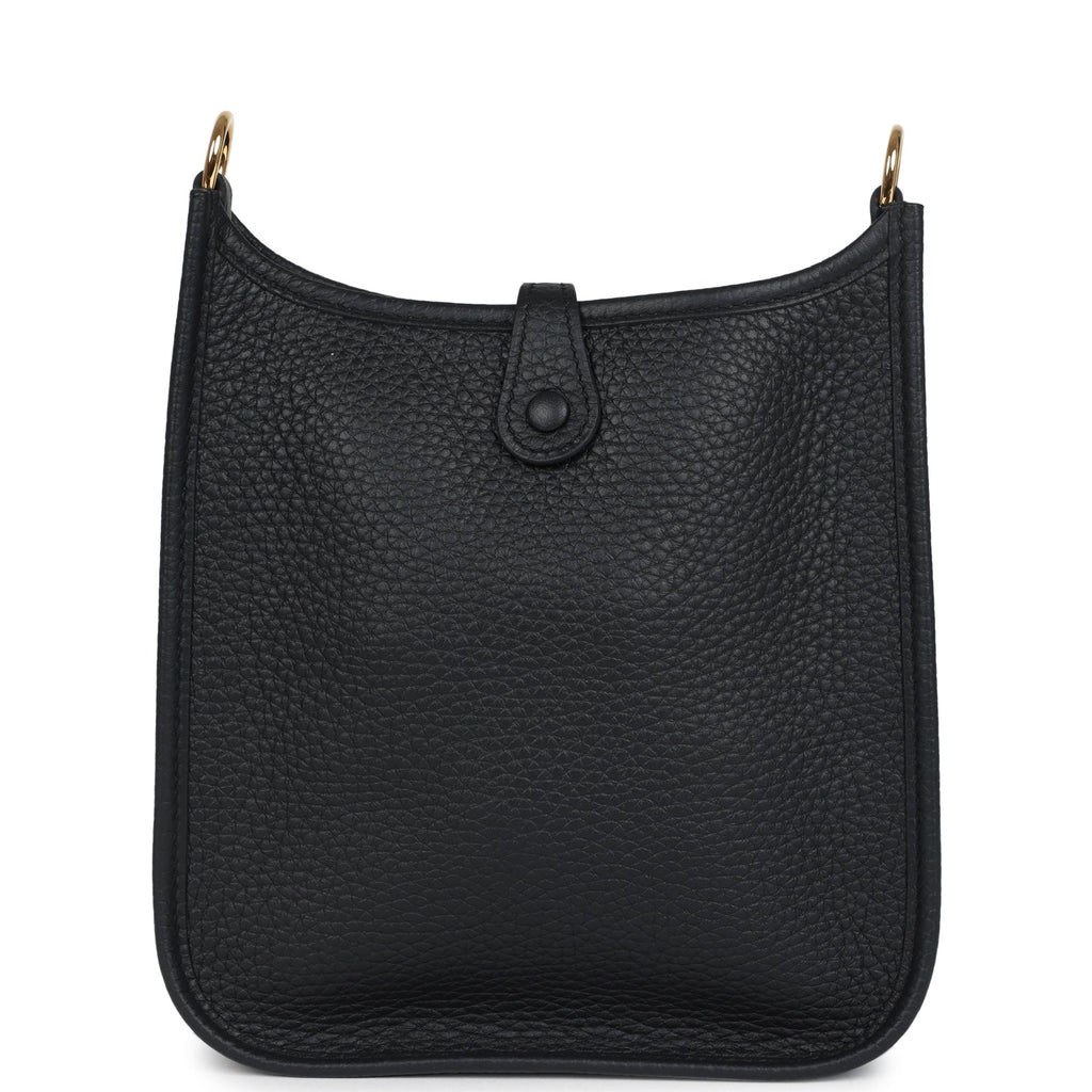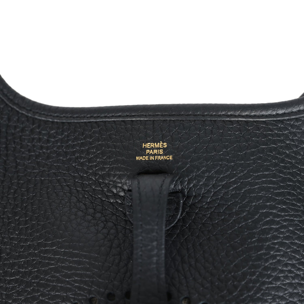 Hermes Evelyne TPM Black Clemence Gold Hardware Shop for an authentic Hermes Evelyne TPM in Black clemence leather with gold hardware in new and never worn condition at Madison Avenue Couture.