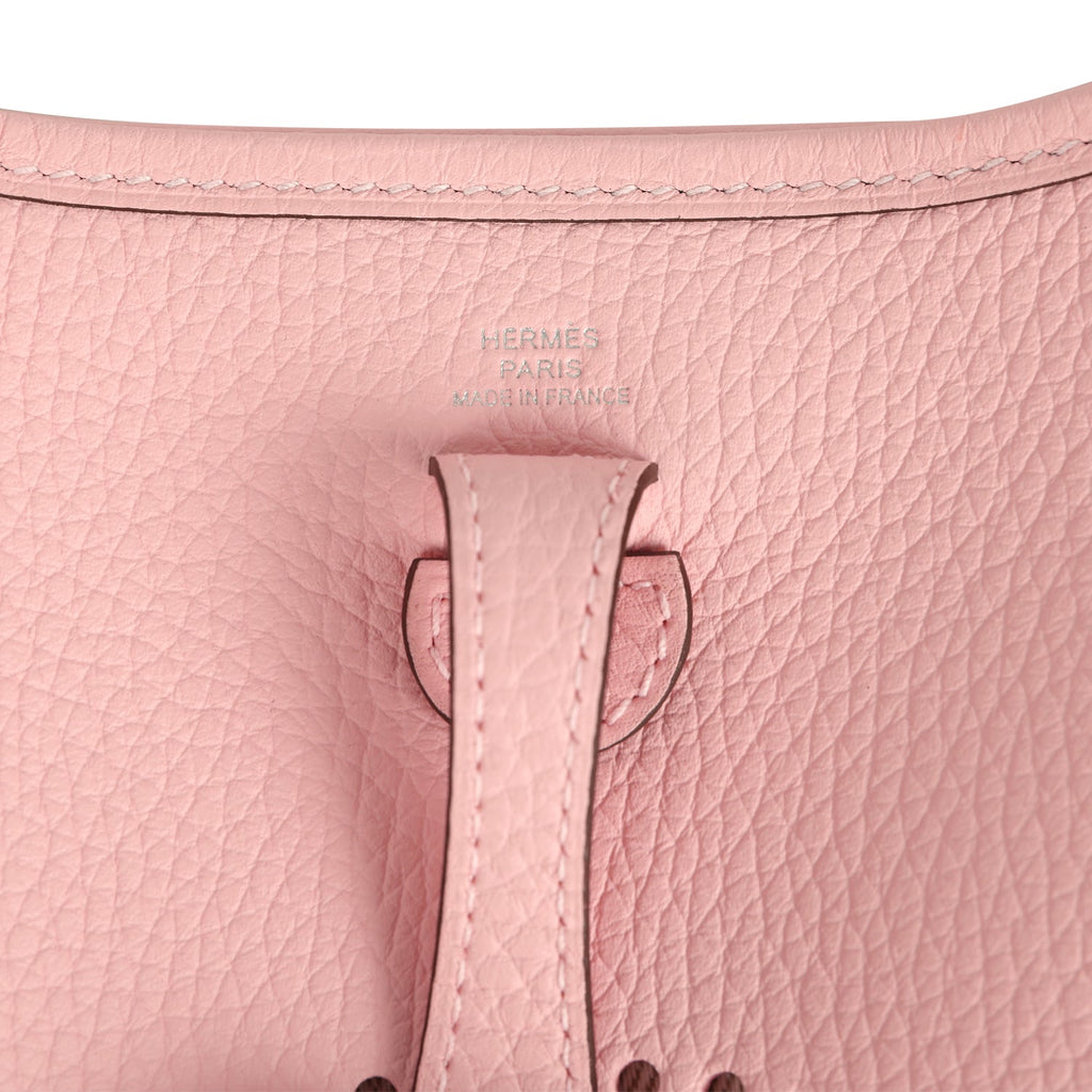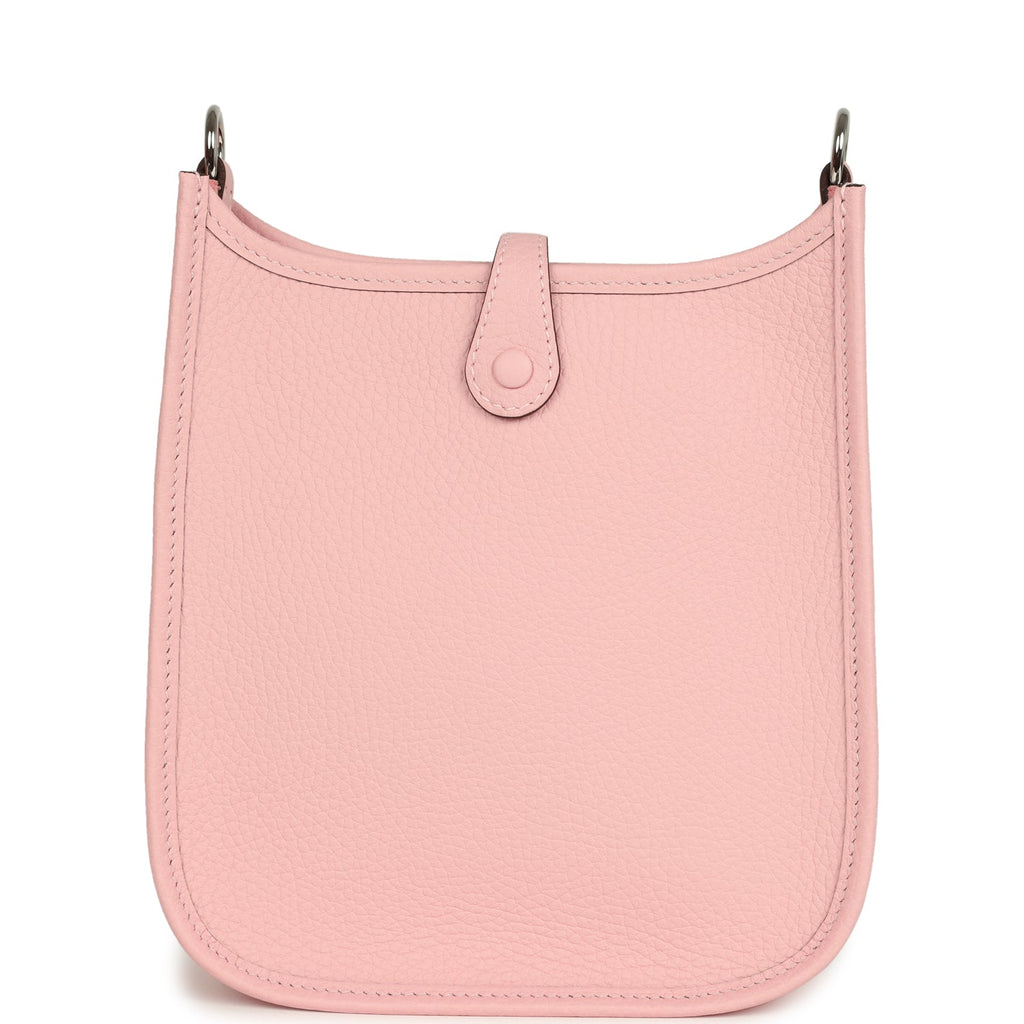 Hermes Evelyne TPM Rose Sakura Clemence Palladium Hardware Shop for an authentic Hermes Evelyne TPM in Rose Sakura clemence leather with palladium hardware in new and never worn condition at Madison Avenue Couture.