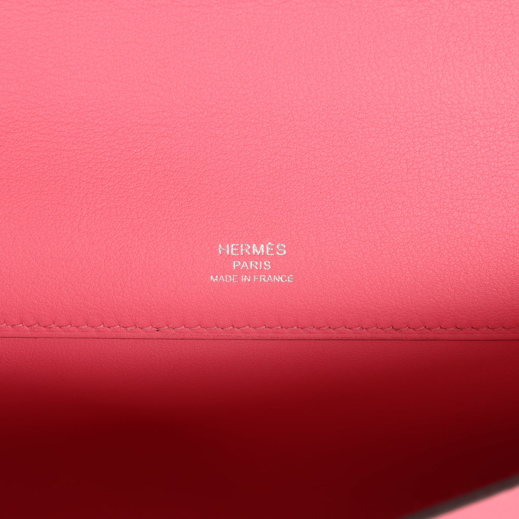 This Kelly Cut wallet is in Rose Azalee swift leather with palladium hardware, features tonal stitching, front flap, pull straps that attach to a toggle, and small top handle.