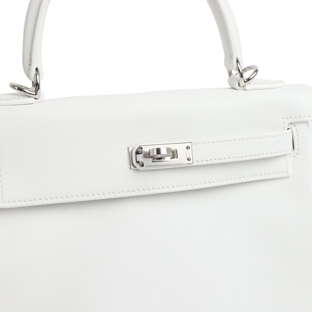 Hermes Kelly Retourne 25 New White Swift Palladium Hardware Shop for an authentic Hermes Kelly Retourne 25 in New White swift leather with palladium hardware in new and never worn condition at Madison Avenue Couture.