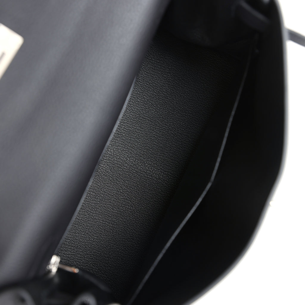This Kelly, in the Retourne style, is in Black togo leather with palladium hardware and has tonal stitching, front flap, two straps with center toggle closure, clochette with lock and two keys, single rolled handle and removable shoulder strap.The interior is lined in Black chevre and has one zip pocket with Hermes engraved pull and two open pockets on the opposite side.Collection: W (2024)Origin: FranceCondition: New and never worn (plastic on hardware)Accompanied by: Hermes box, Hermes dustbag, clochette, lock, two keys, shoulder strap, clochette dustbag, shoulder strap dustbag, felt and carebookMeasurements: 11.25″ width x 8.25″ height x 4.75″ depth; 3.5″ handle drop