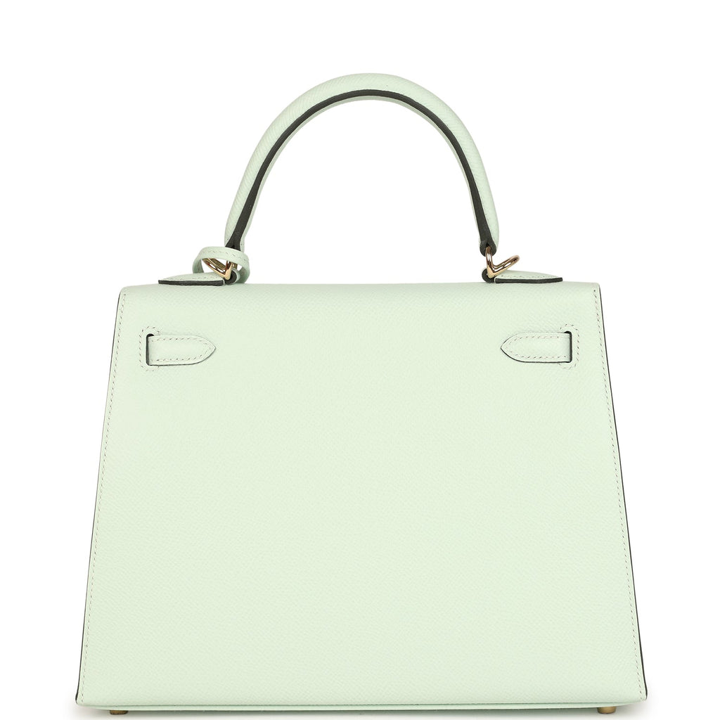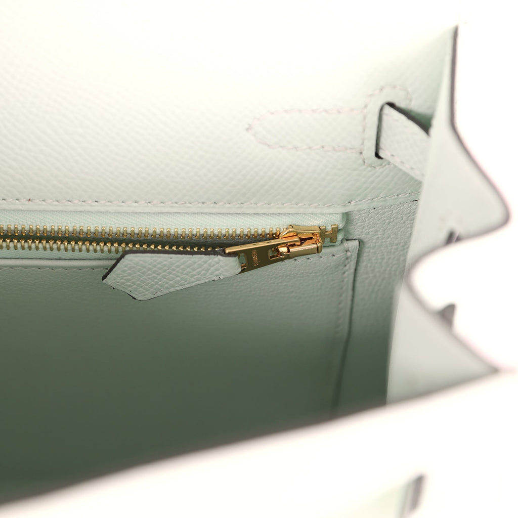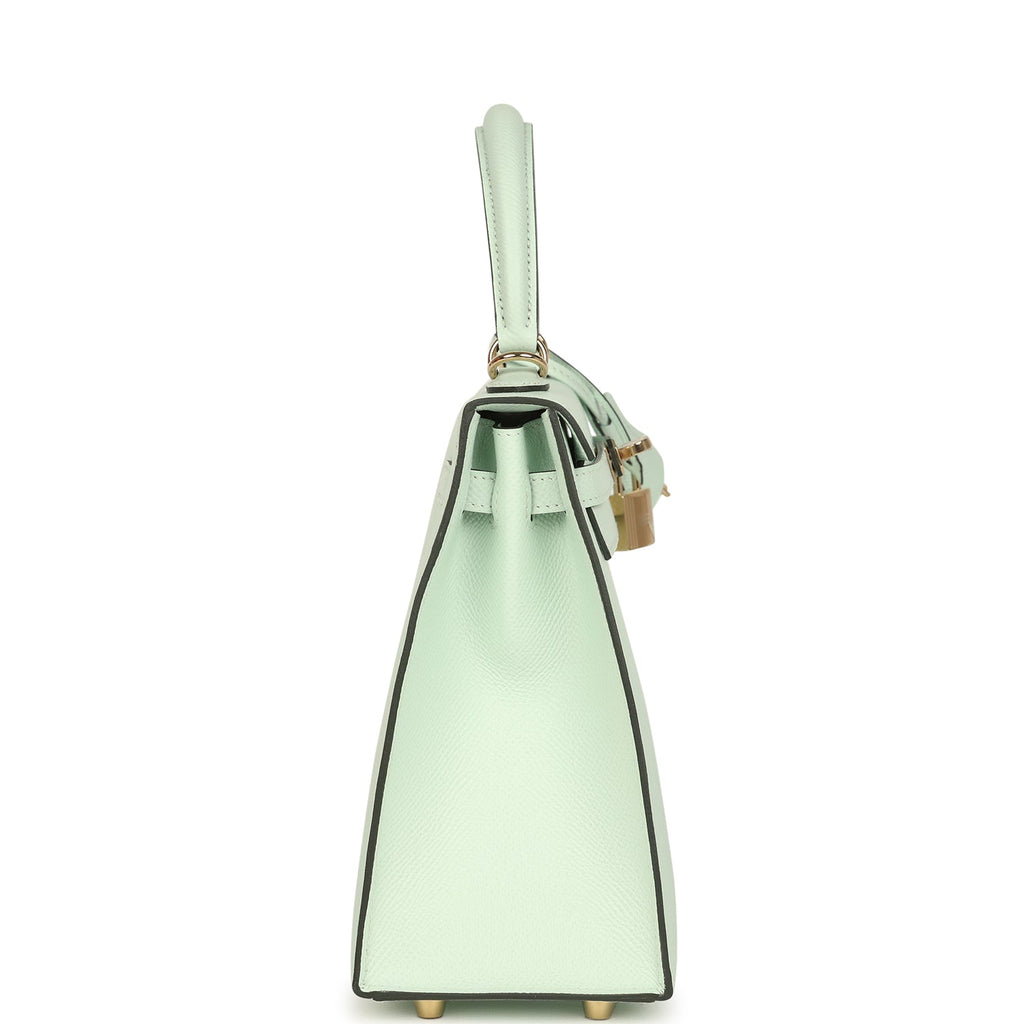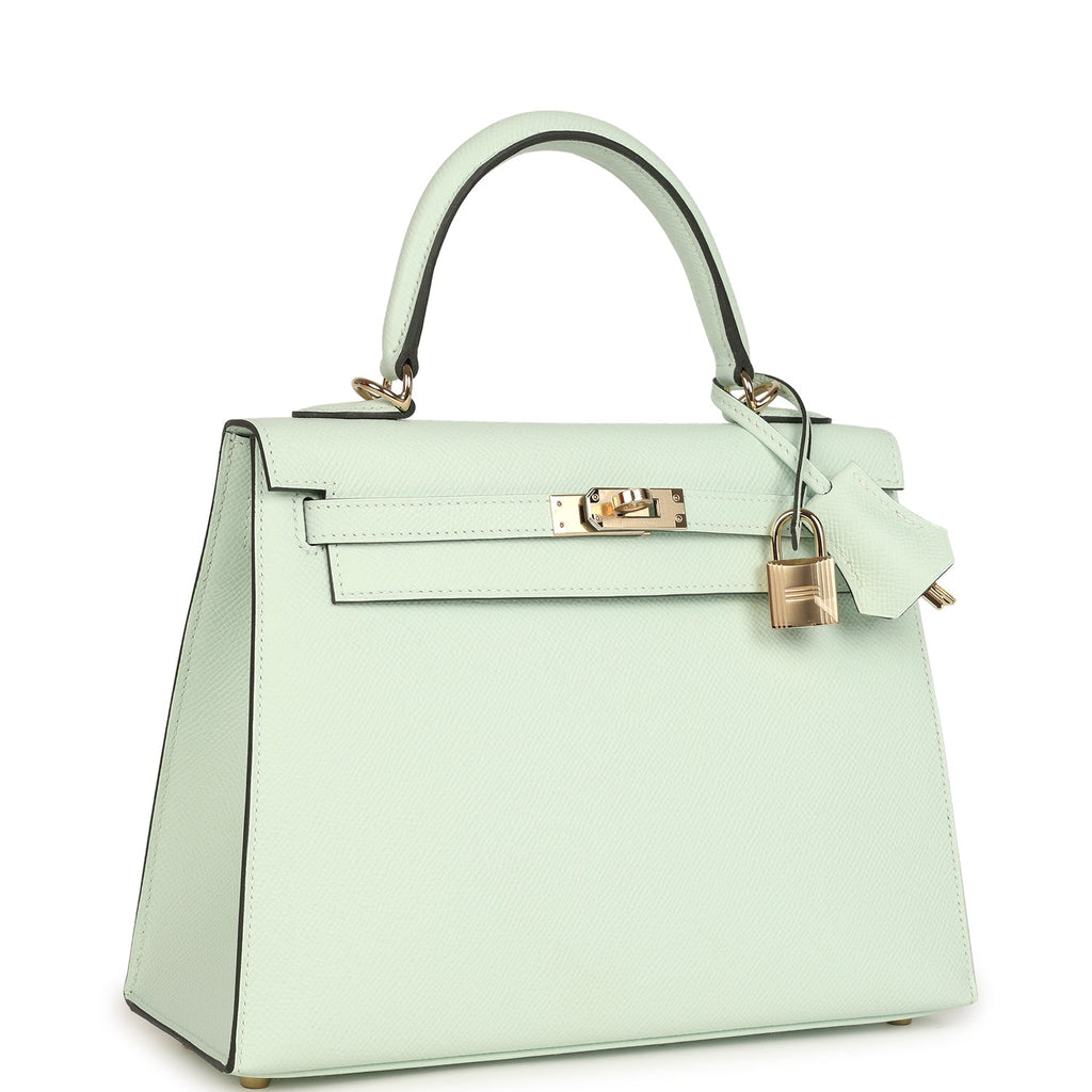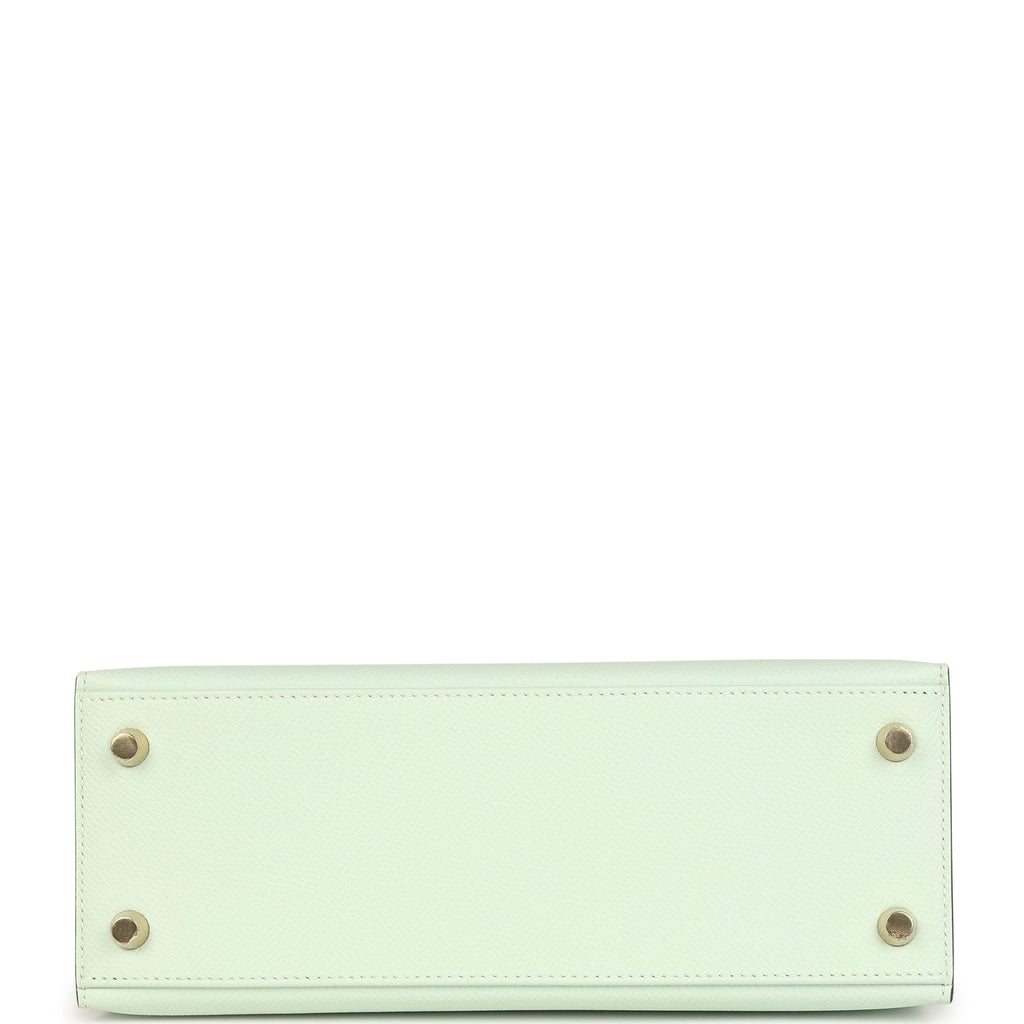 Hermes Kelly Sellier 25 Vert Peppermint Epsom Permabrass Hardware Shop for an authentic Hermes Kelly Sellier 25 in Vert Peppermint epsom leather with permabrass hardware in new and never worn condition at Madison Avenue Couture.