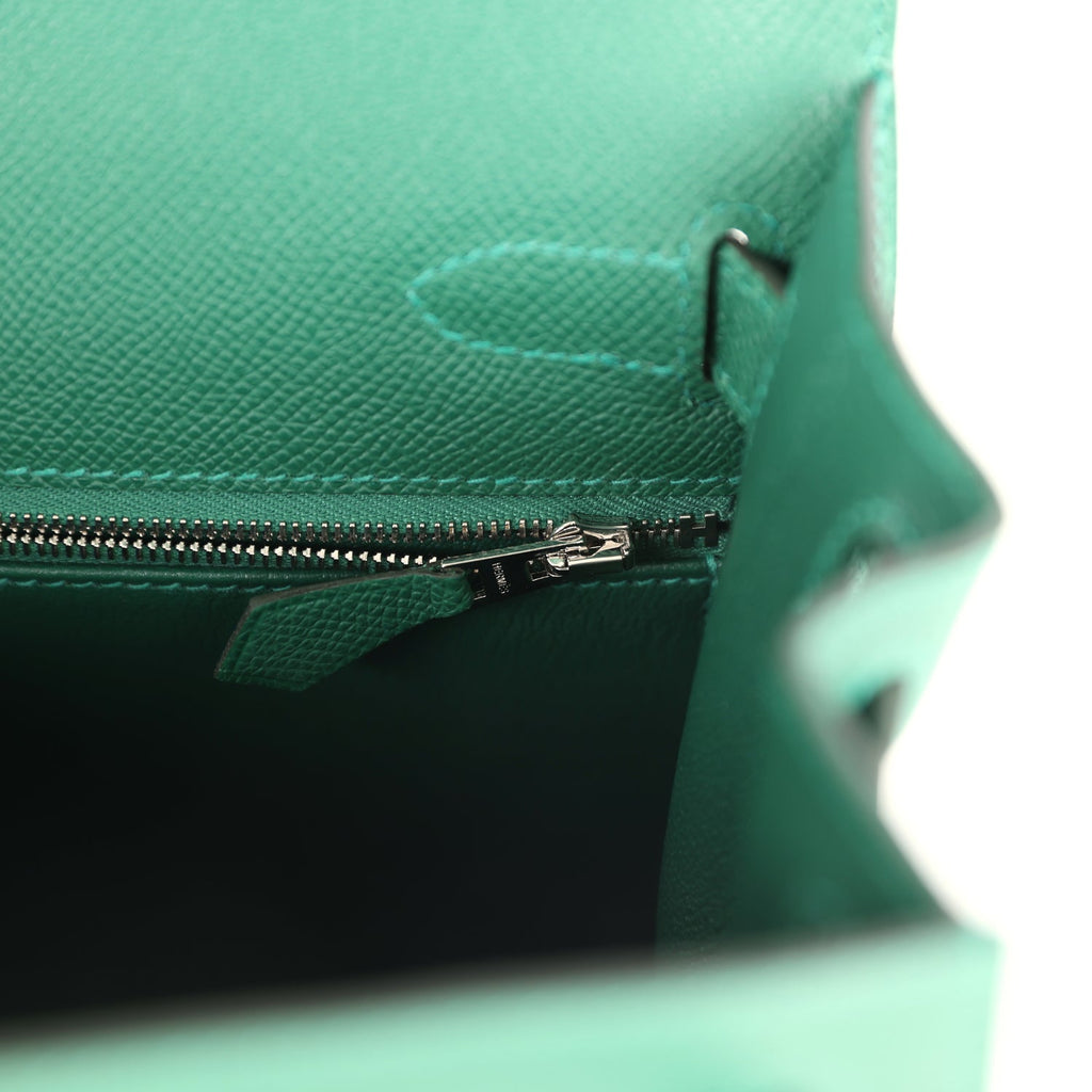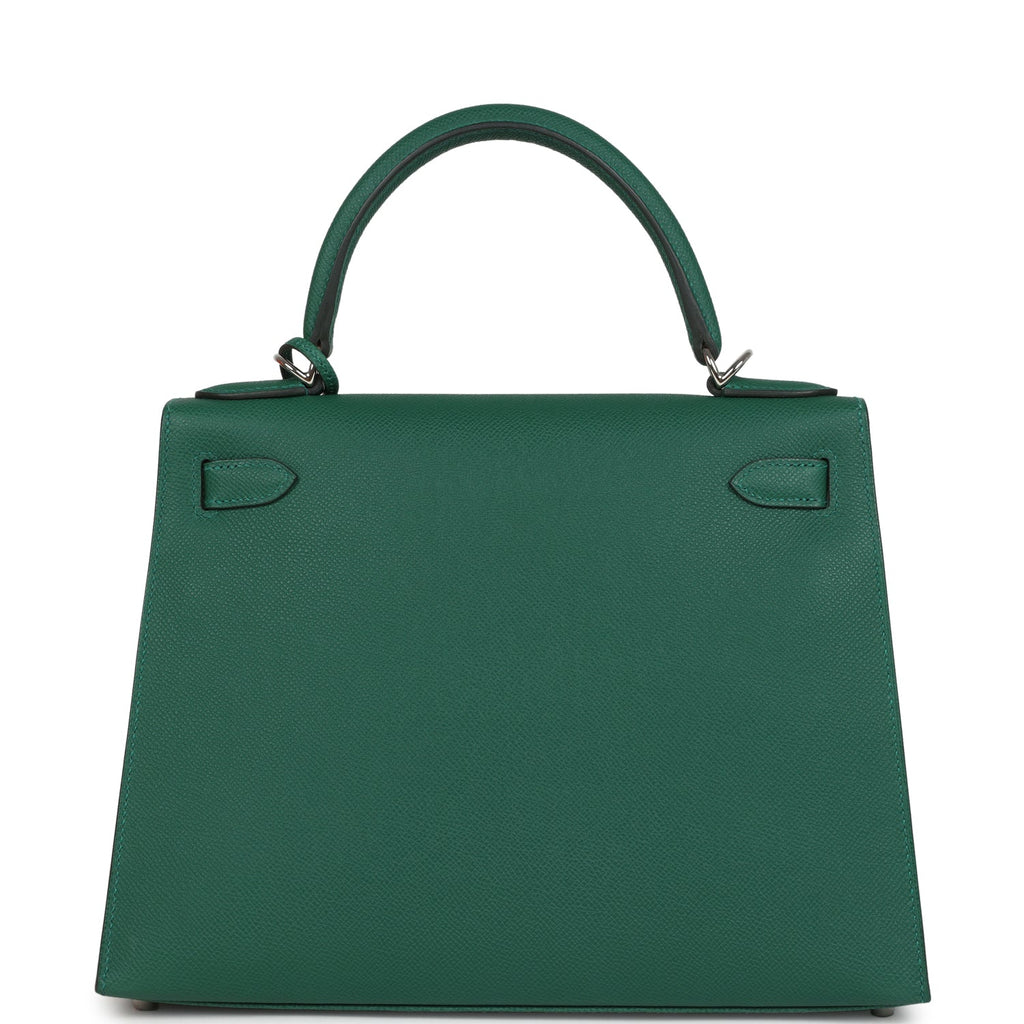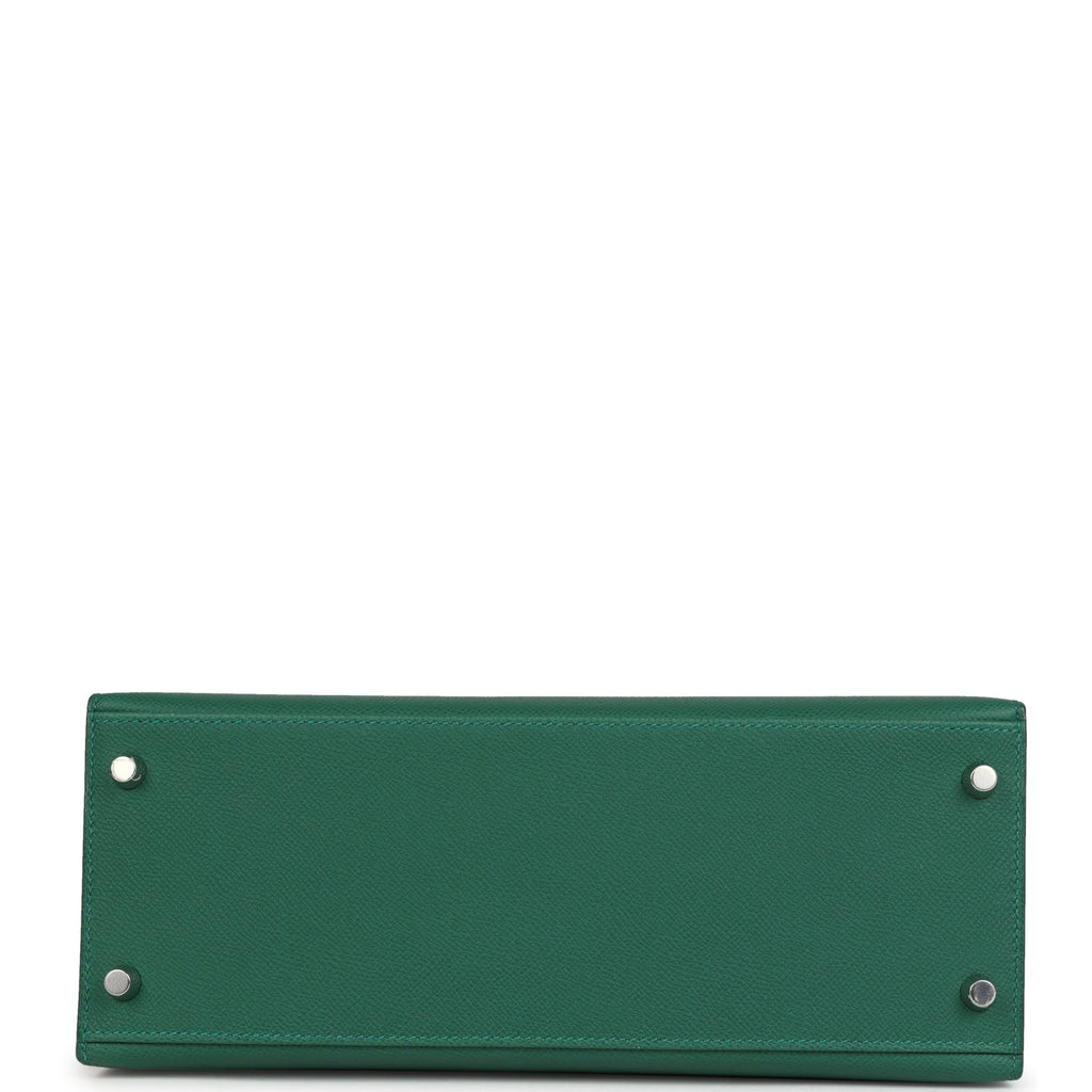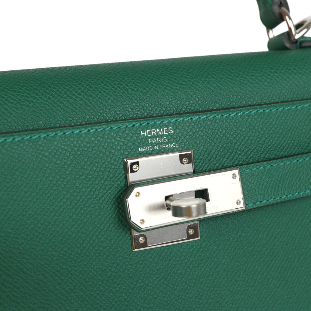 Hermes Kelly Sellier 28 Vert Moyen Epsom Palladium Hardware Shop for an authentic Hermes Kelly Sellier 28 in Vert Moyen epsom leather with palladium hardware in new and never worn condition at Madison Avenue Couture.