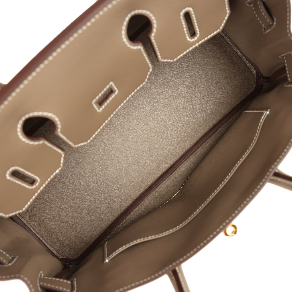This Shoulder Birkin Light 29 is in Etoupe evercolor leather with gold hardware and has white contrast stitching, two straps with front toggle closure, clochette with lock and two keys and double rolled handles.The interior is lined in Etoupe chevre leather and has two interior slip pockets.Collection: K (2025)Origin: FranceCondition: New and never worn (plastic on hardware)Accompanied by: Hermes box, Hernes dustbag, clochette, lock, two keys, clochette dustbag, felt, carebookMeasurements: 11.5″ width x 6.25″ height x 5.2″ depth; 5.75″ handle drop