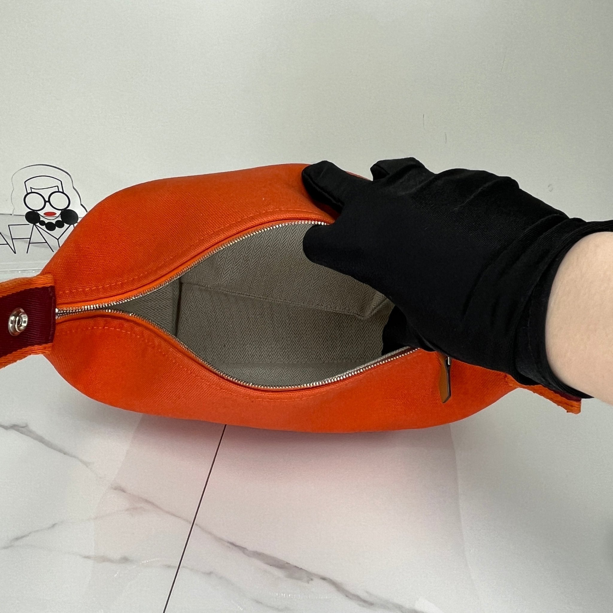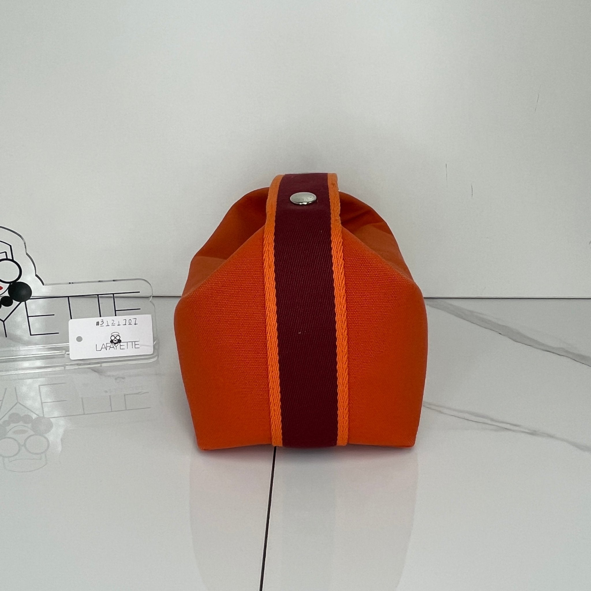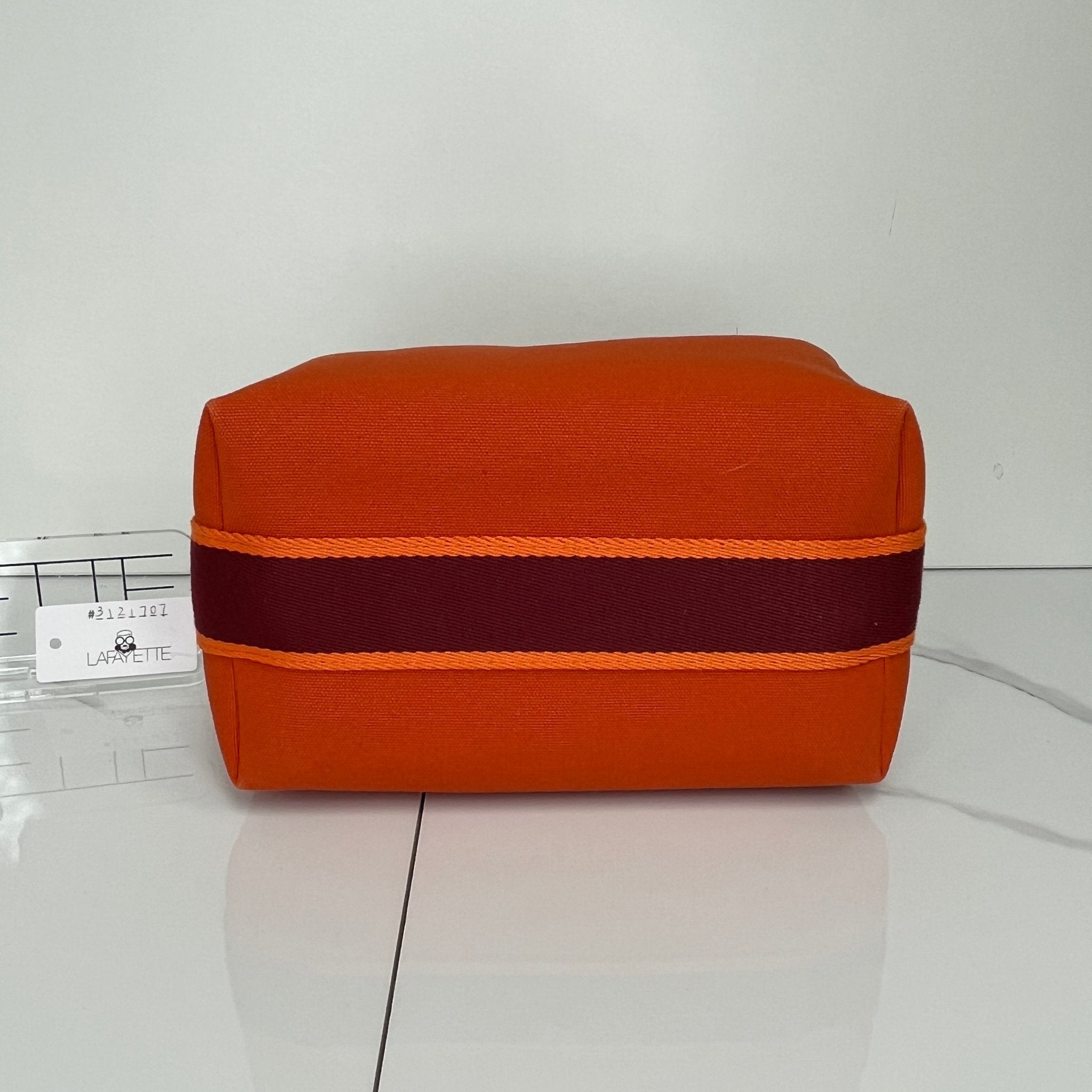 Elevate your essentials with the Hermes Small Toile Bride-A-Brac Case in vibrant orange. Crafted with meticulous attention to detail, this compact case seamlessly combines style and functionality, making it the perfect statement accessory for your daily needs.