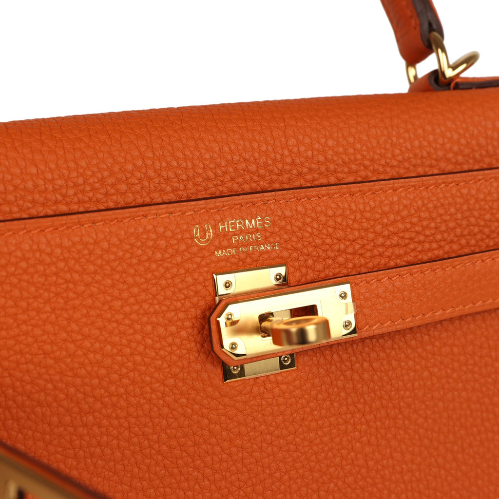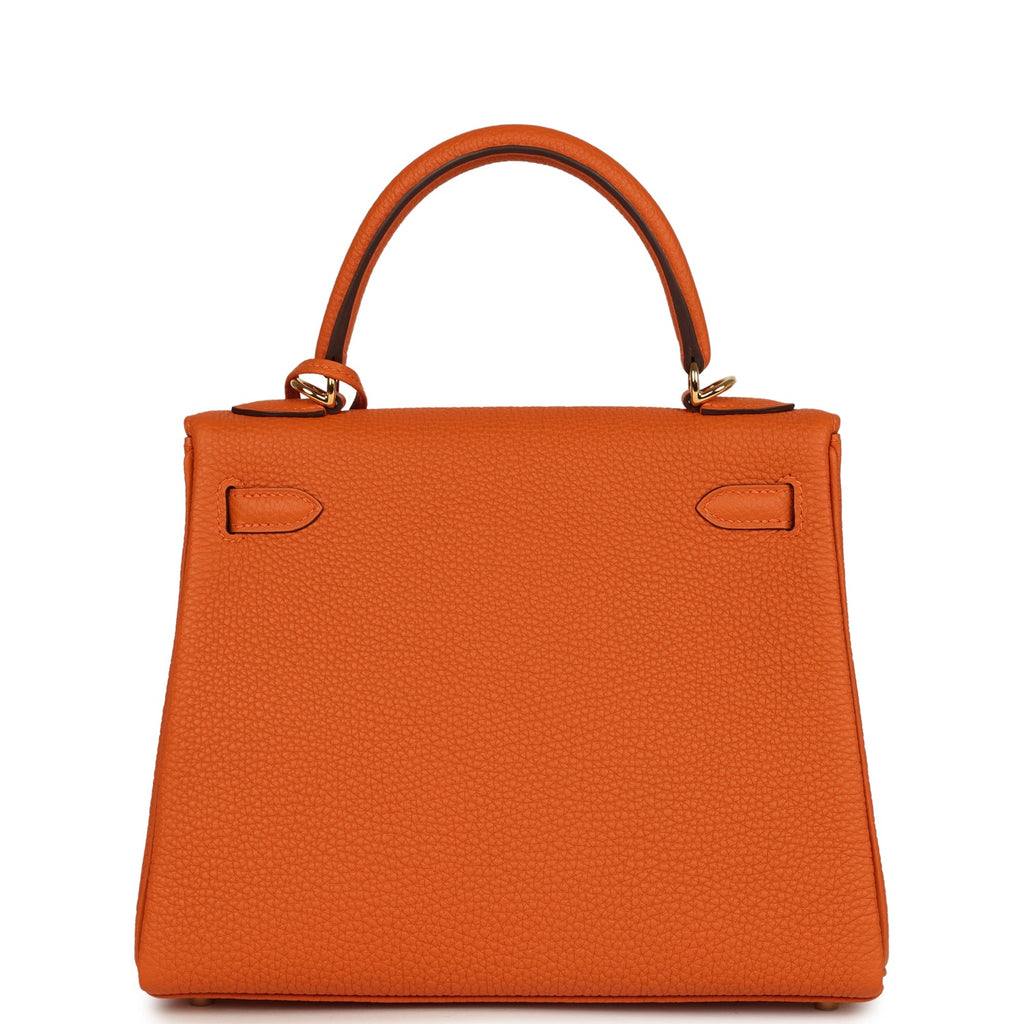 Hermes Special Order (HSS) Kelly Retourne 25 Orange Verso Togo Gold Hardware Shop for an authentic Hermes (HSS) Kelly 25 in Orange Verso togo leather with gold hardware in new and never worn condition at Madison Avenue Couture.