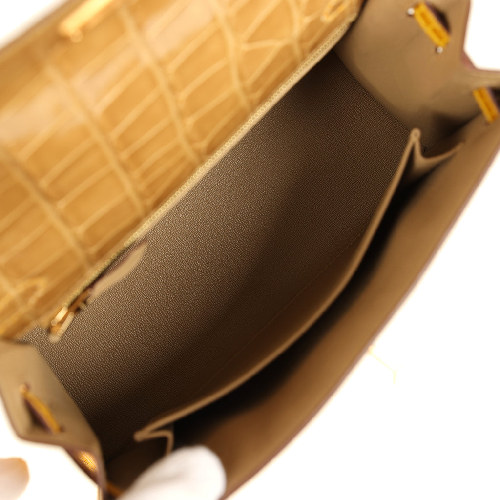 Hermes Special Order (HSS) Kelly Sellier 25 Beige Sable and Jaune Ambre Shiny Alligator Mississpiensis Brushed Gold Hardware Shop for an authentic Hermes Special Order (HSS) Sellier Kelly 25 in Beige Sable and Jaune Ambre Shiny Alligator Mississpiensis with brushed gold hardware in never worn condition at Madison Avenue Couture.