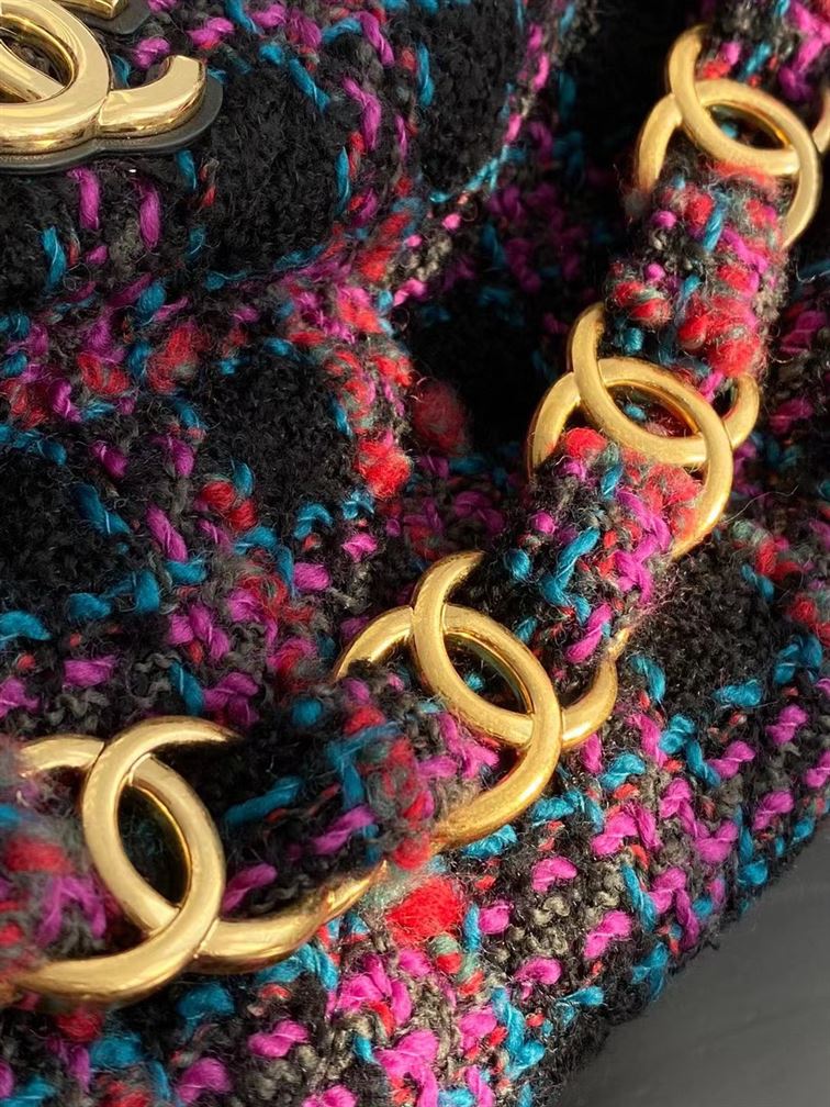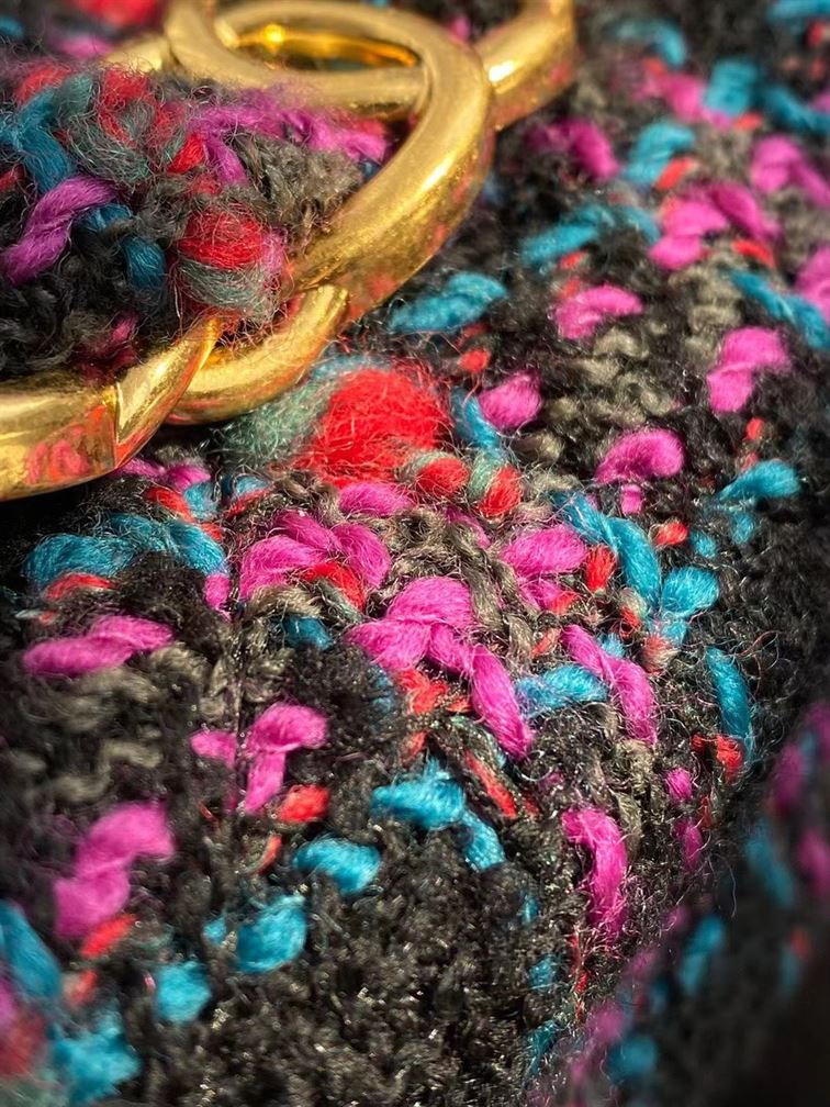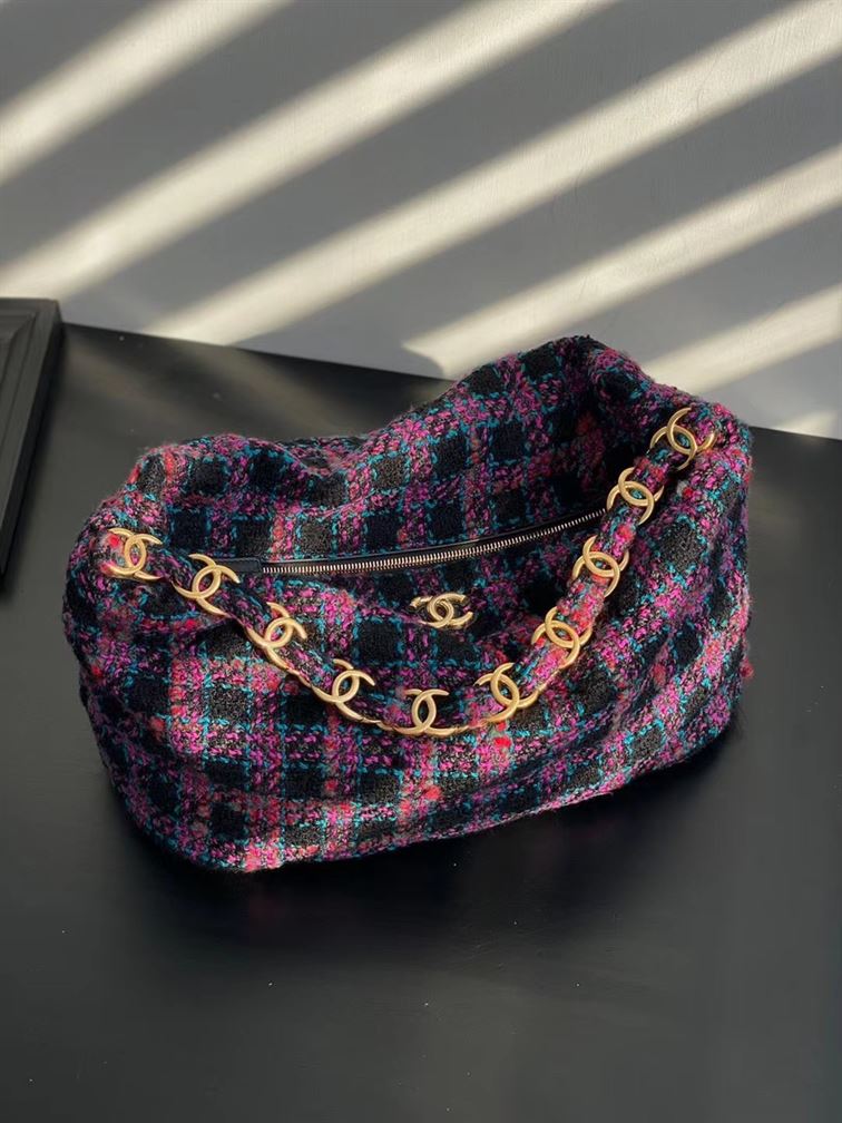 The Maxi Hobo Bag is crafted in Wool Tweed & Gold-Tone Metal and is available in Black, Purple, Green & Red.