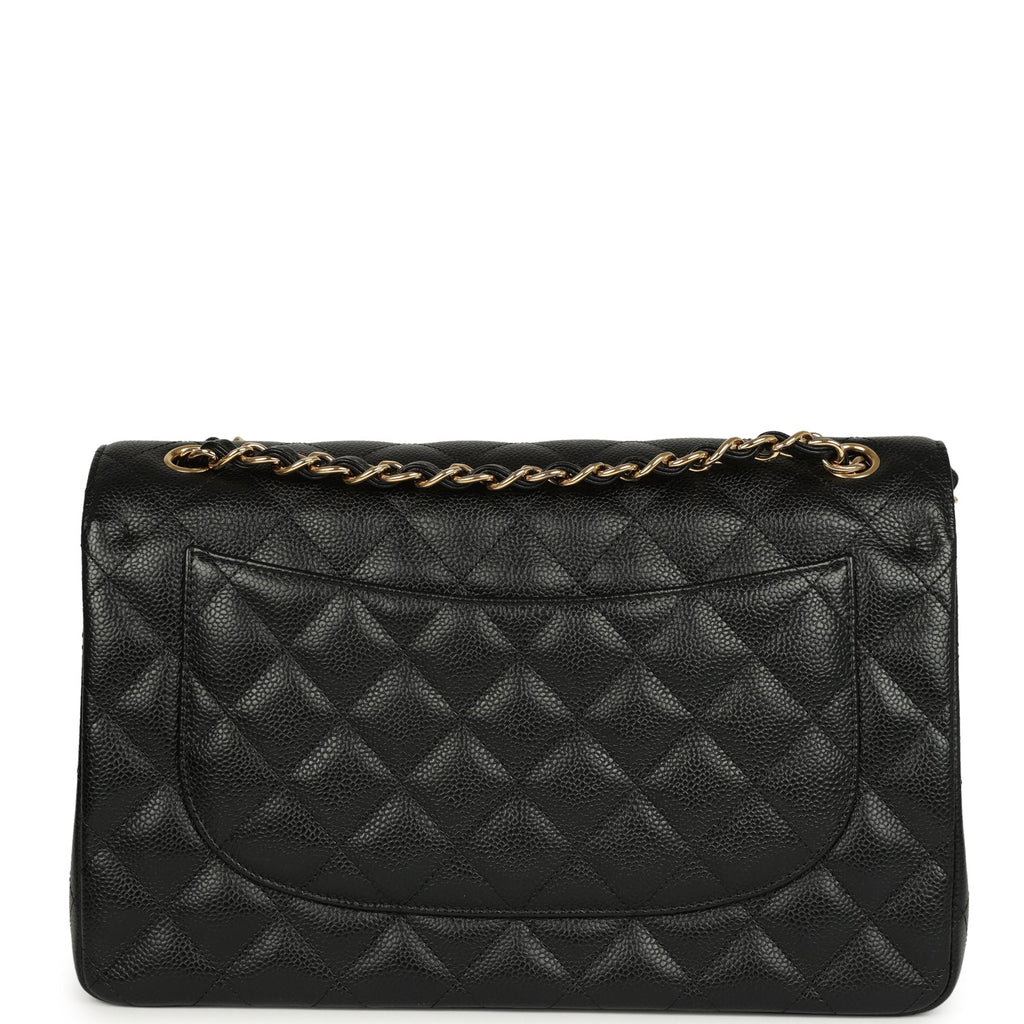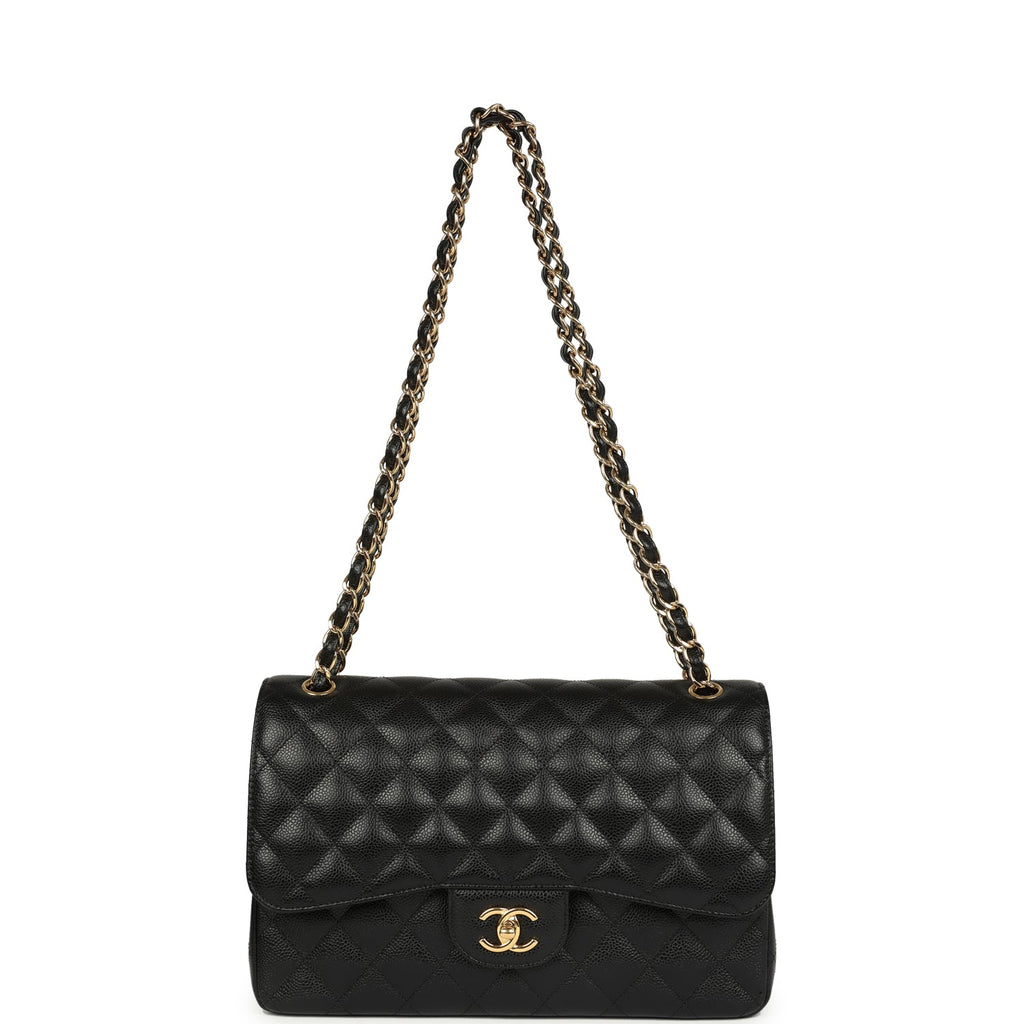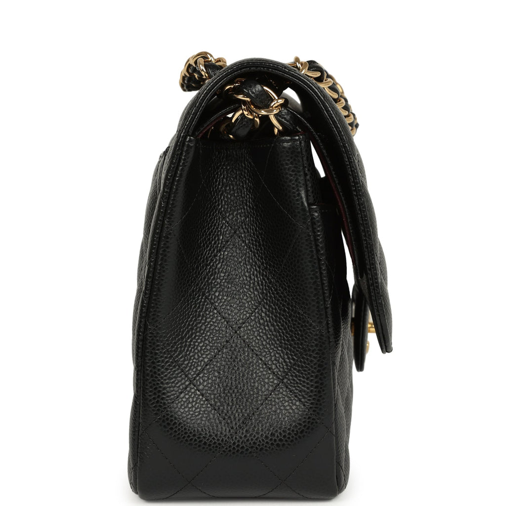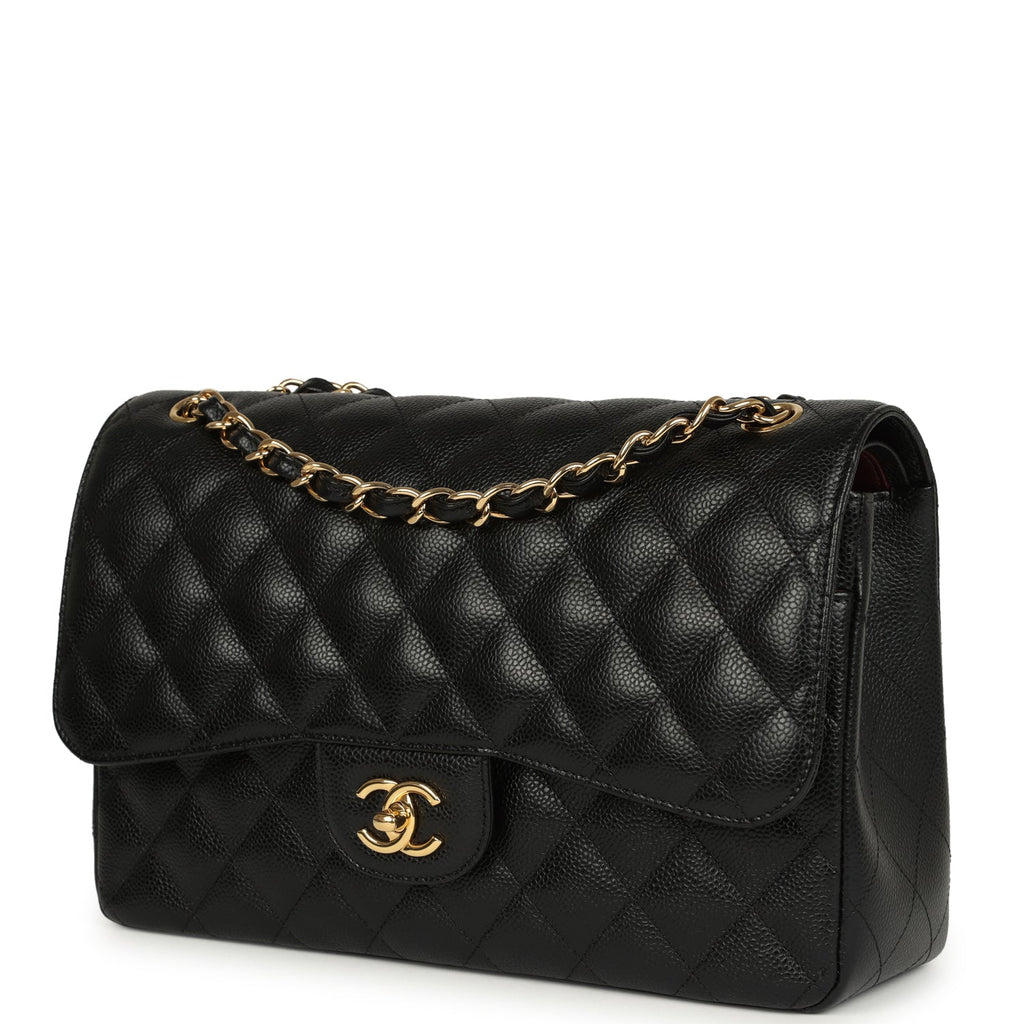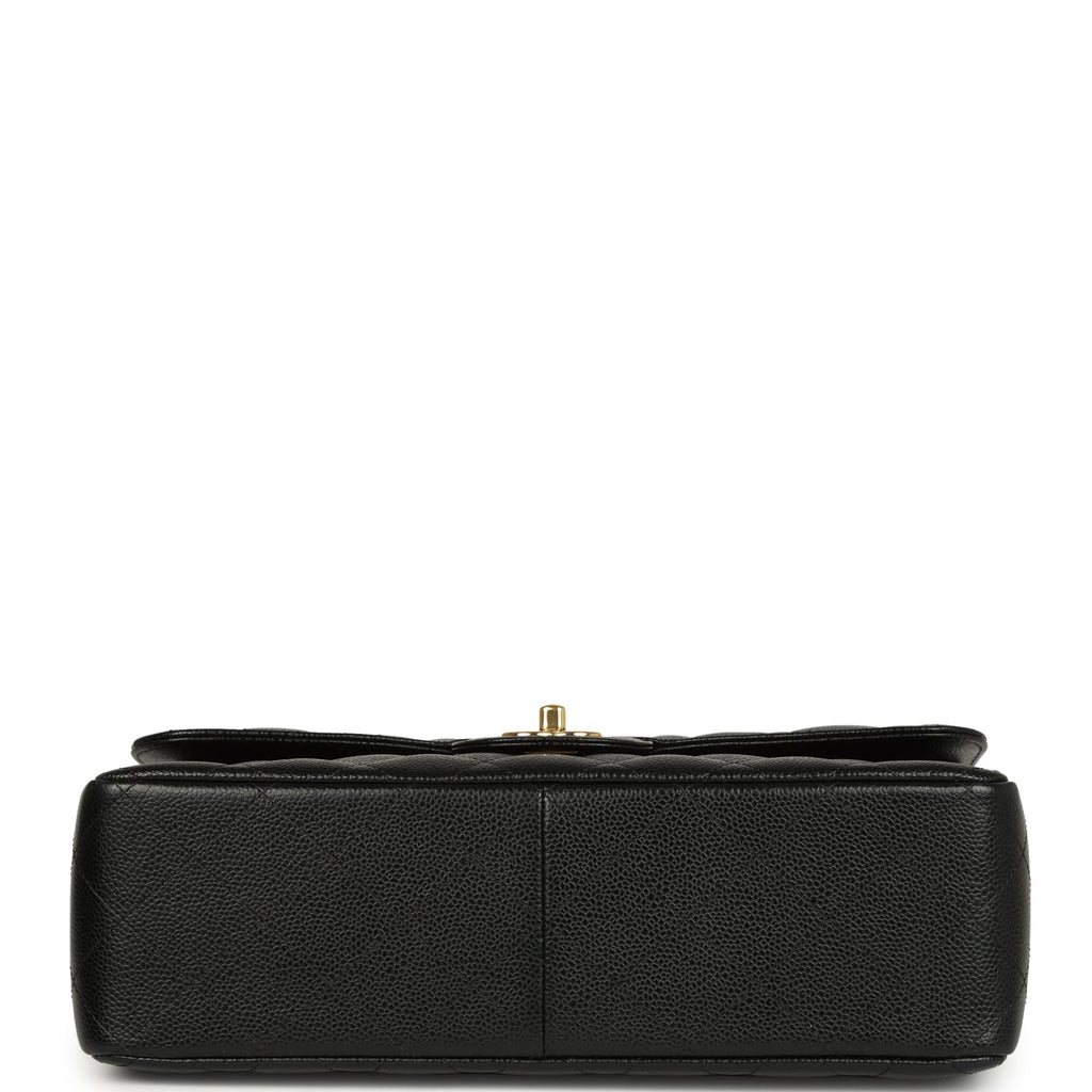 Pre-owned Chanel Jumbo Classic Double Flap Bag Black Caviar Gold Hardware Shop for an authentic pre-owned Chanel Jumbo Double Flap in black caviar leather with gold tone hardware in excellent to mint condition at Madison Avenue Couture.