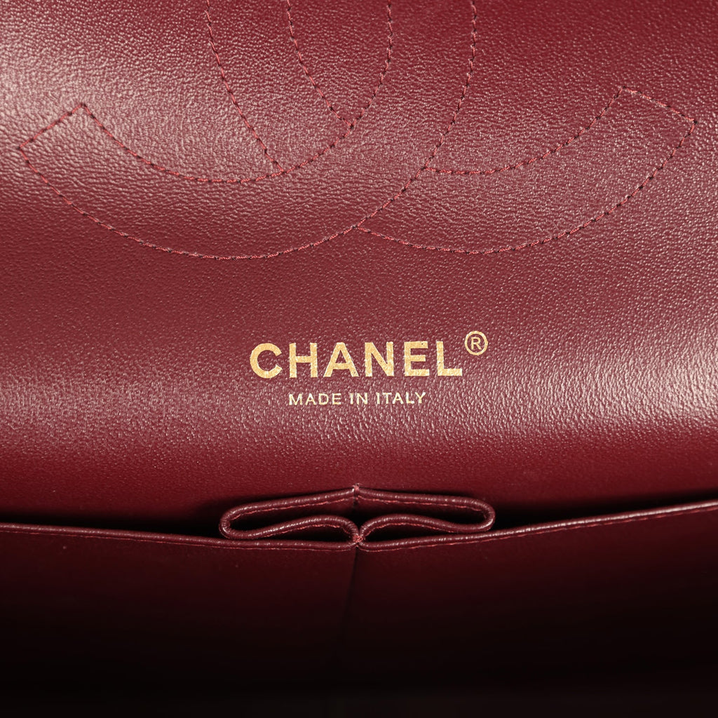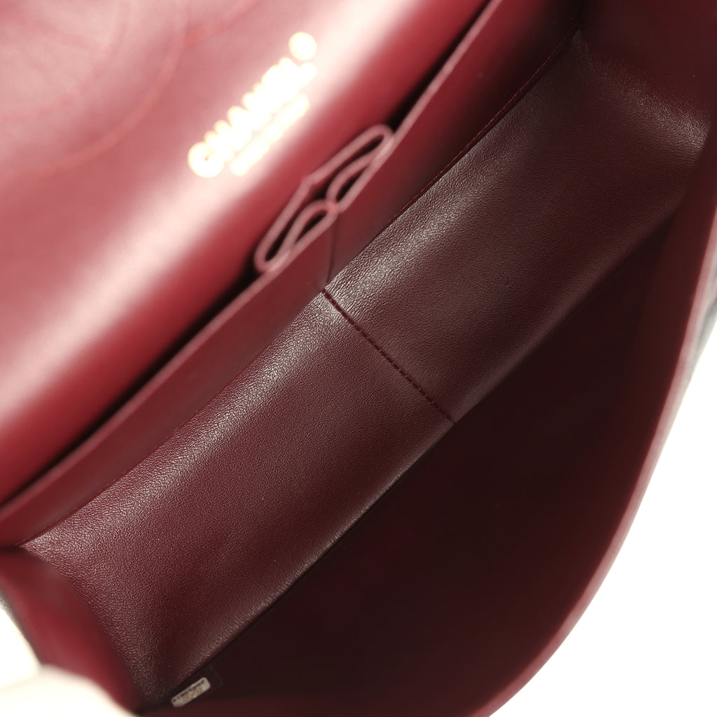 This Jumbo Classic Double Flap bag is in black caviar leather with gold tone hardware and features a front flap with signature CC turnlock closure, half moon back pocket, and adjustable interwoven gold tone chainlink and black leather shoulder strap.The interior is lined in burgundy leather with a “love letter” zipper compartment under the first flap, an “outer” slit pocket under the second flap, and an interior compartment with two open pockets separated by a “lipstick” compartment.Collection: 25-Series (2017-2018)Origin: ItalyCondition: Pre-owned; Excellent to Mint – This bag retains its shape structure. The exterior leather is clean overall with no sign of wear except the back pocket leather has some minor scuffing along the edging on one side. There is no plastic on the front cc turnlock closure. There are faint hairline scratches to the turnlock hardware. The interior flap has three light indentations/press marks from the zipper and shoulder strap hardware. The interior burgundy leather is clean overall except there are a few faint scuffs along the very top edging including to the front pocket.Accompanied by: Chanel box, Chanel dustbag, COA card, carebook, ribbonMeasurements: 12″ width x 8″ height x 3.5″ depth; 23″ strap drop: 23″ (13″ doubled)