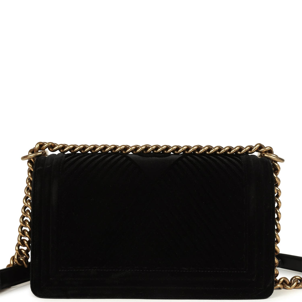 Pre-owned Chanel Medium Boy Bag Black Chevron Velvet Antique Gold Hardware Shop for an authentic pre-owned Chanel Medium Boy Bag in black chevron velvet leather with antique gold hardware in excellent condition at Madison Avenue Couture.