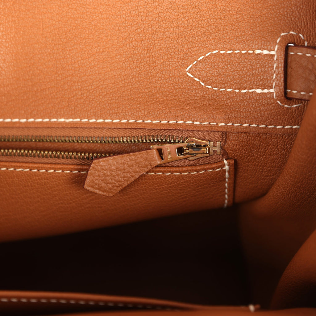 This Birkin is in Gold togo leather with gold hardware and features contrast stitching, front flap, two straps with center toggle closure, clochette with lock and two keys, and double rolled handles.The interior is lined with Gold chevre leather and has a zip pocket with an Hermes engraved zipper pull and an open pocket on the opposite side.Collection: Q Square (2013)Origin: FranceCondition: Pre-owned; Mint – This bag retains its shape structure. There is partial plastic on the hardware. The exposed turnlock, turnlock plate, and pontets have hairline scratches while the exposed lock and feet have more noticeable scratches present. The exterior leather is clean with no signs of wear. The interior leather has a few very faint marks to the base but is otherwise clean with minimal signs of wear.Accompanied by: Hermes box (pre-owned), Hermes dustbag, clochette, lock, two keys, carebookMeasurements: 11.75″ width x 9.5″ height x 6″ depth; 4.25″ handle drop