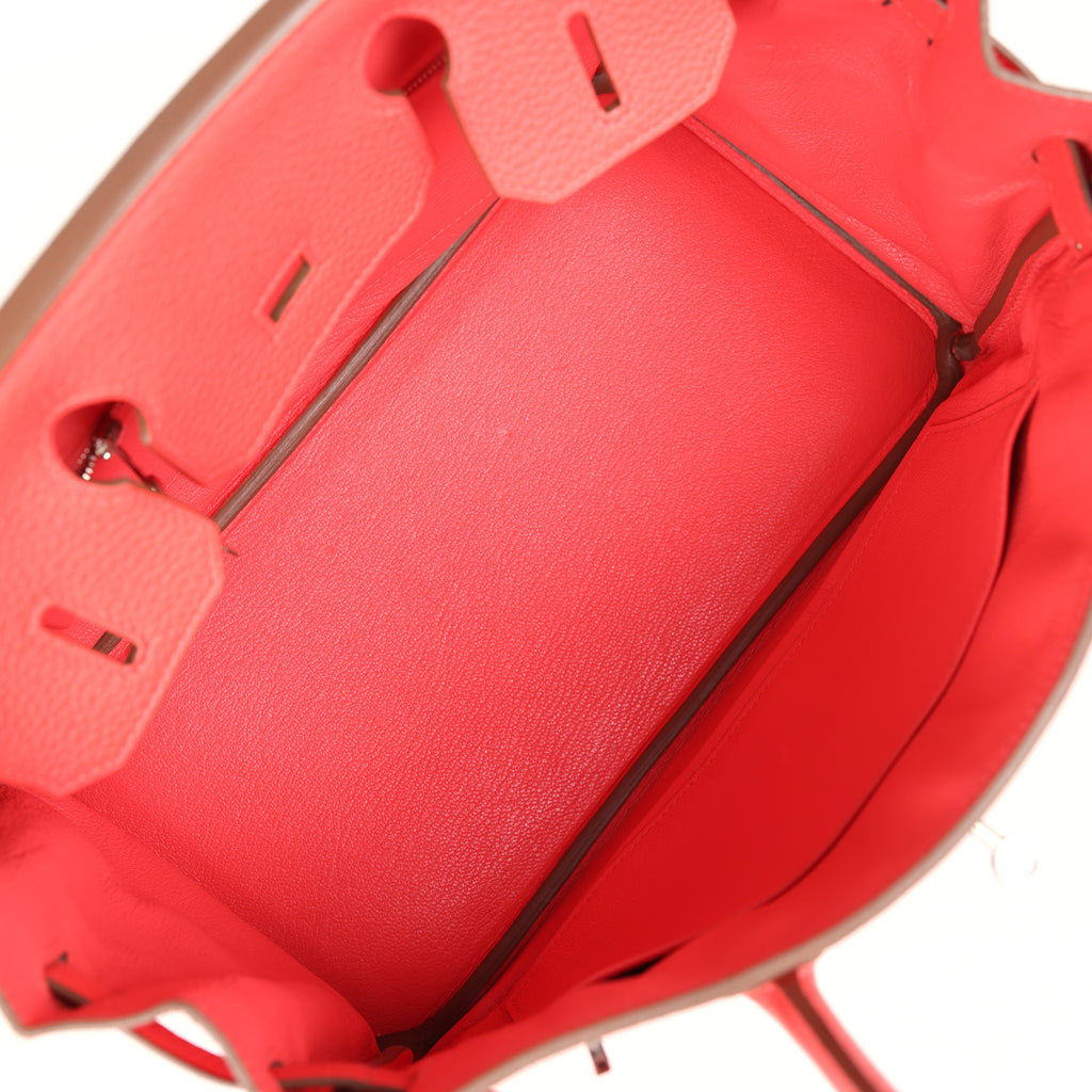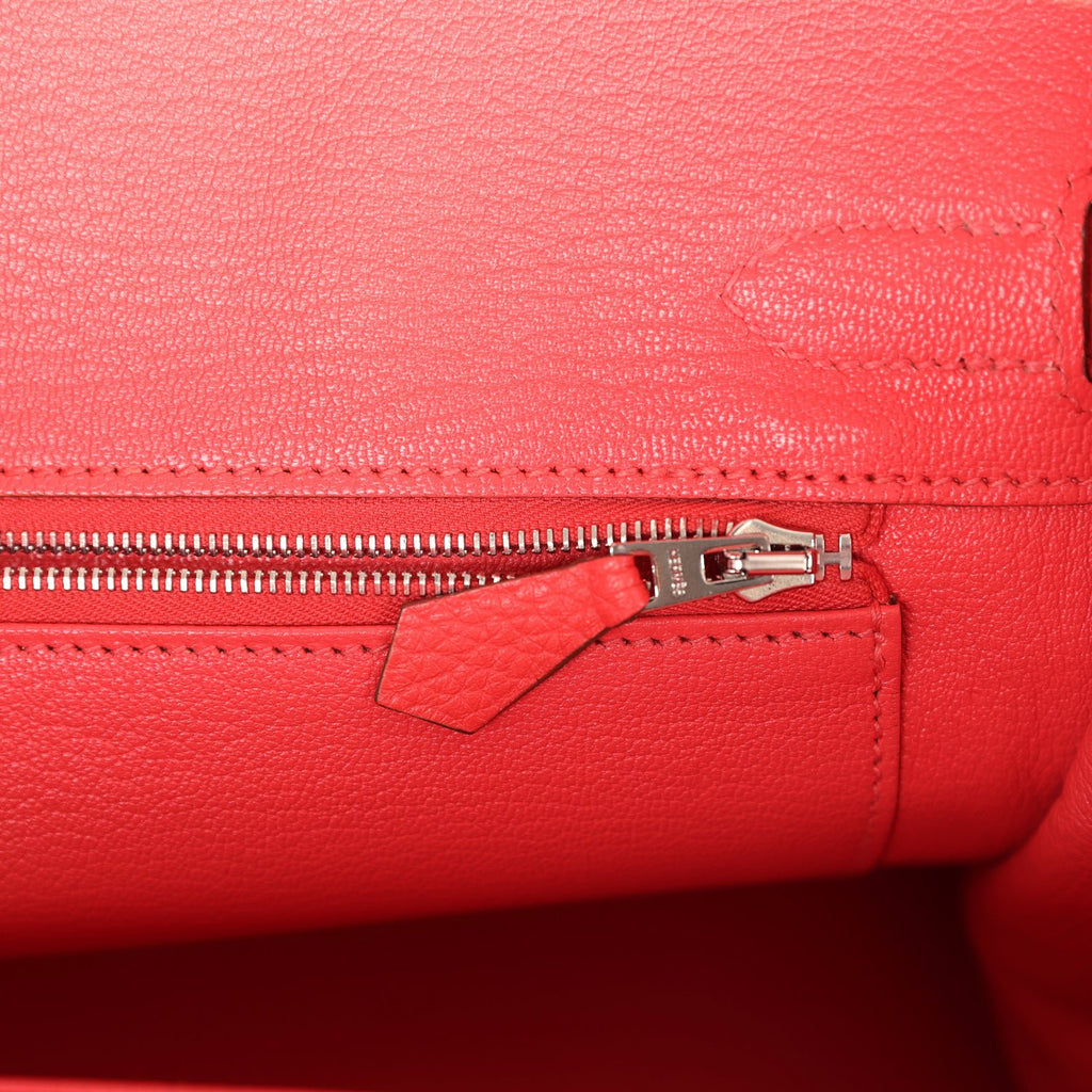 This Birkin is in Rose Jaipur clemence leather with palladium hardware and has tonal stitching, front flap, two straps with center toggle closure, clochette with lock and two keys, and double rolled handles.The interior is lined with Rose Jaipur chevre and has one zip pocket with an Hermes engraved zipper pull and an open pocket on the opposite side.Collection: R Square (2014)Origin: FranceCondition: Pre-owned; Excellent to Mint – This bag retains its shape. The exterior leather is clean with no signs of wear or use. There is no plastic on the hardware except on the turn lock. There is light but visible scratches throughout the exposed hardware. The interior leather is clean with no signs of wear or use.Accompanied by: Hermes dustbag, clochette, lock, two keysMeasurements: 11.75″ width x 9.5″ height x 6″ depth; 4.25″ handle drop