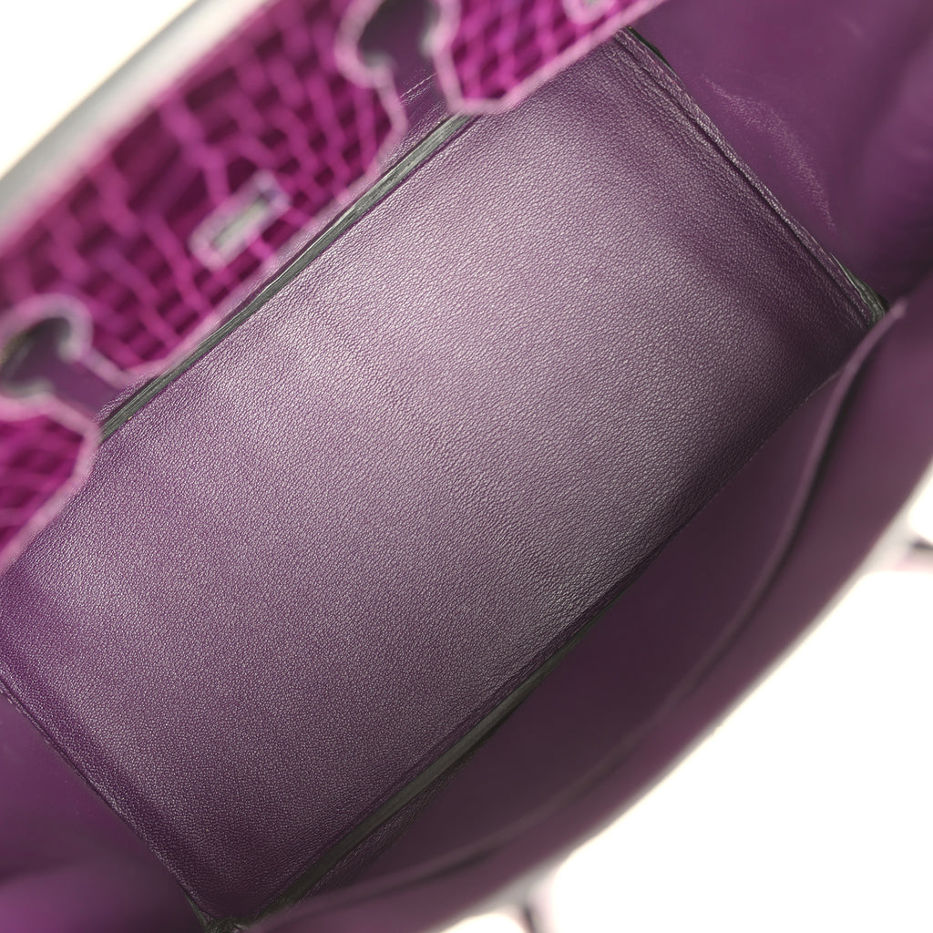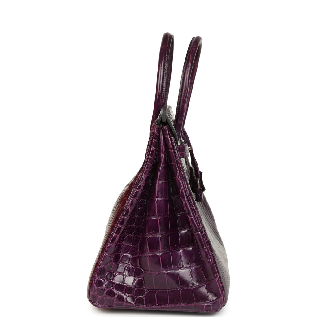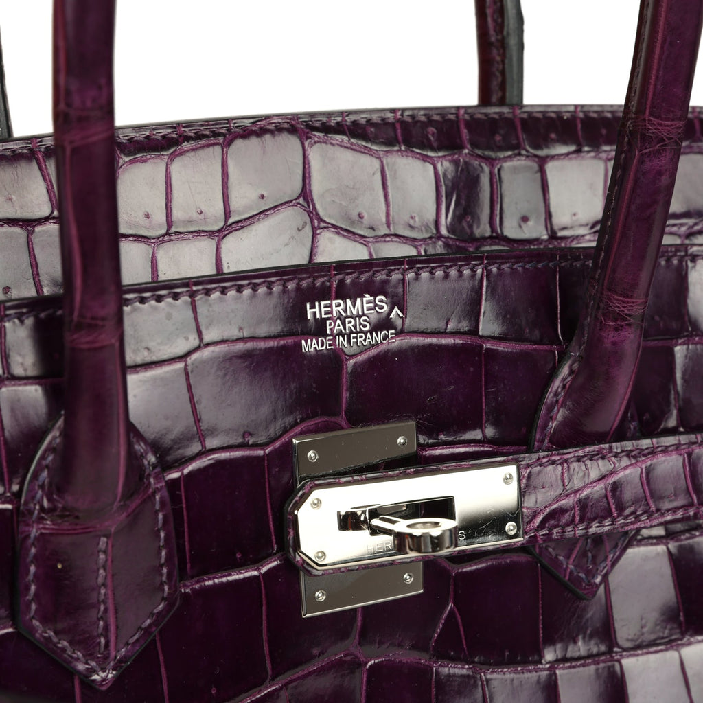Pre-owned Hermes Birkin 35 Amethyst Shiny Porosus Crocodile Palladium Hardware Shop for an authentic pre-owned Hermes Birkin 35 in Amethyst Shiny Porosus Crocodile with palladium hardware in excellent condition at Madison Avenue Couture.