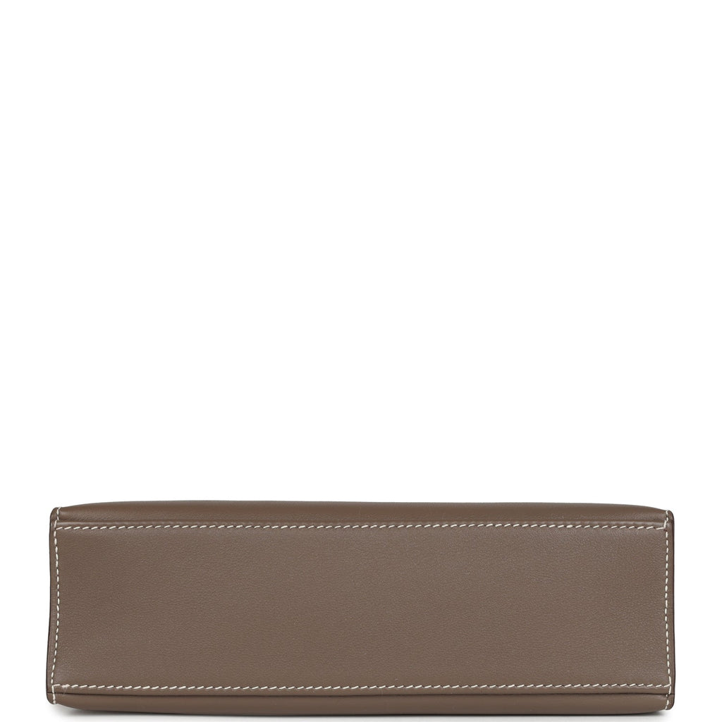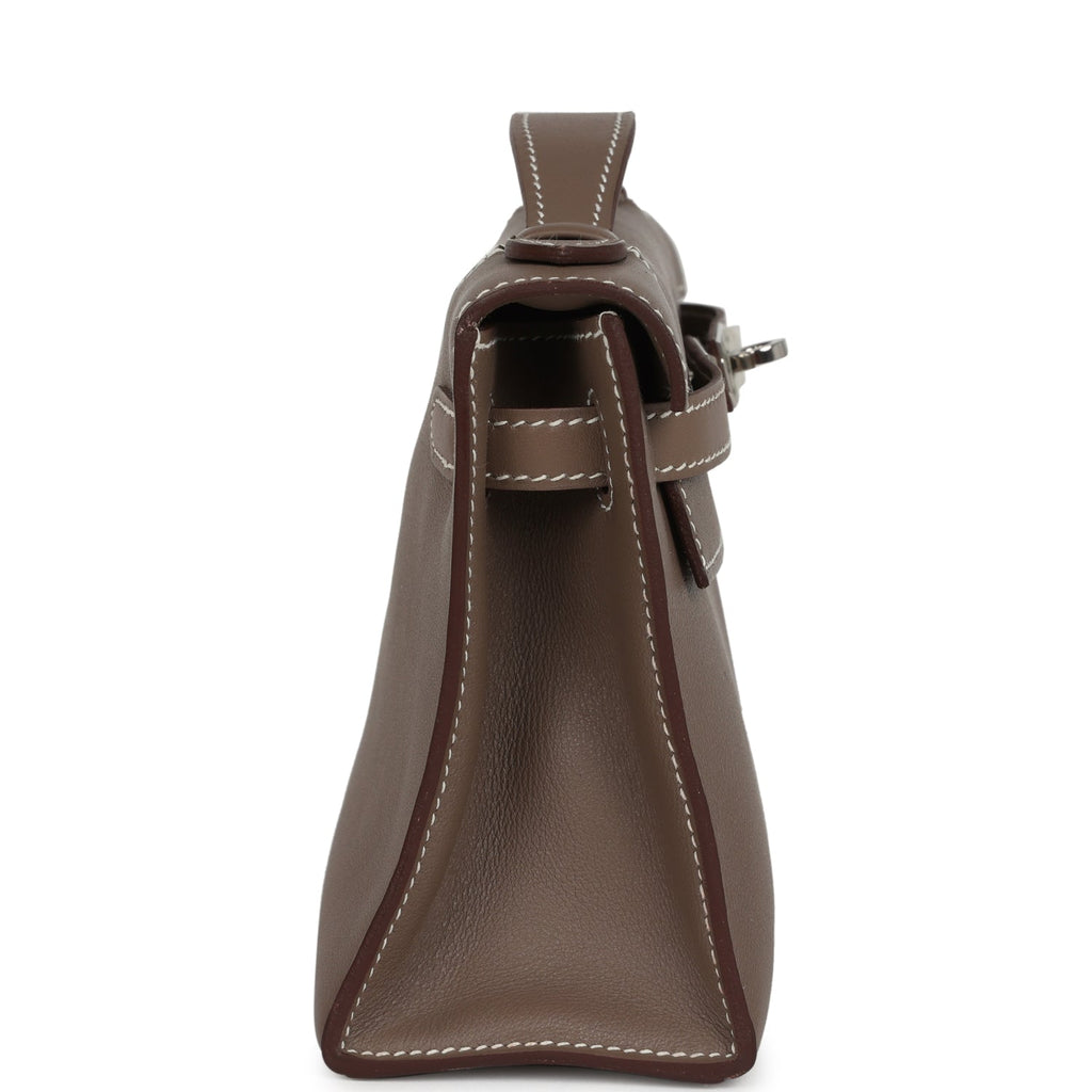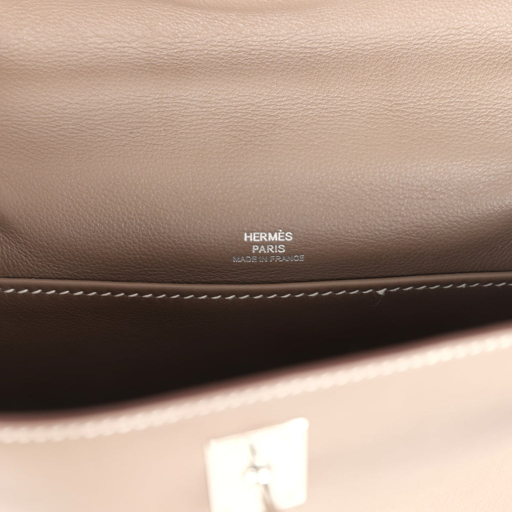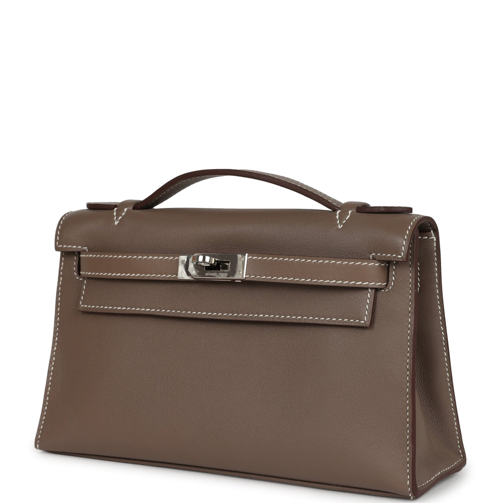 Pre-owned Hermes Kelly Pochette Etoupe Swift Palladium Hardware Shop for an authentic Hermes Kelly Pochette in Etoupe swift leather with palladium hardware in mint condition at Madison Avenue Couture.