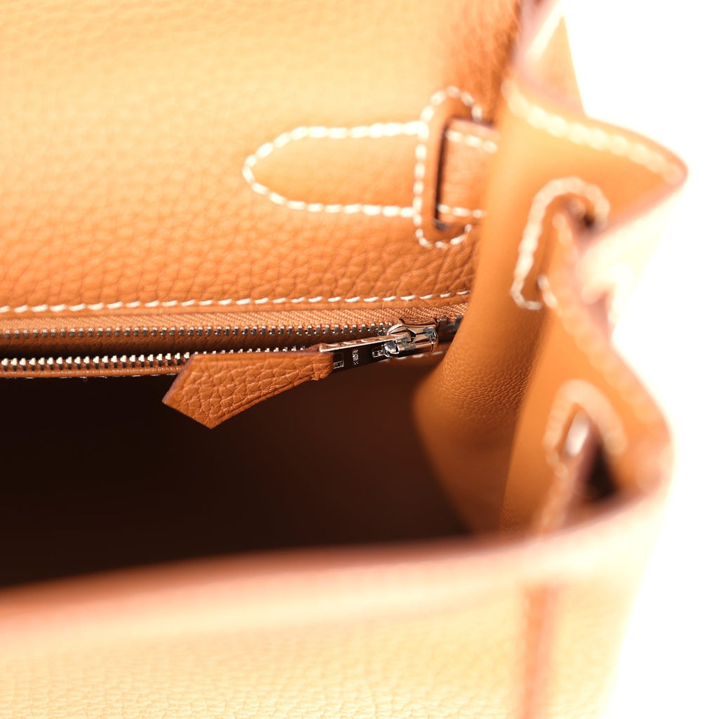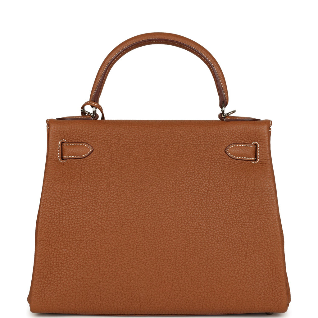 Pre-owned Hermes Kelly Retourne 28 Gold Togo Palladium Hardware Shop for an authentic pre-owned Hermes Kelly Retourne 28 in Gold togo leather with palladium hardware in mint condition at Madison Avenue Couture.