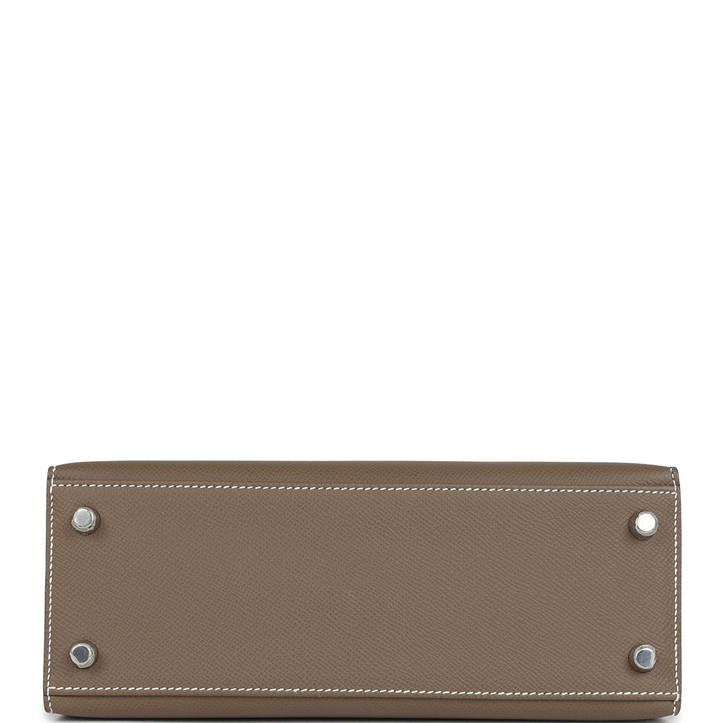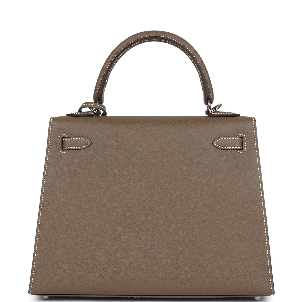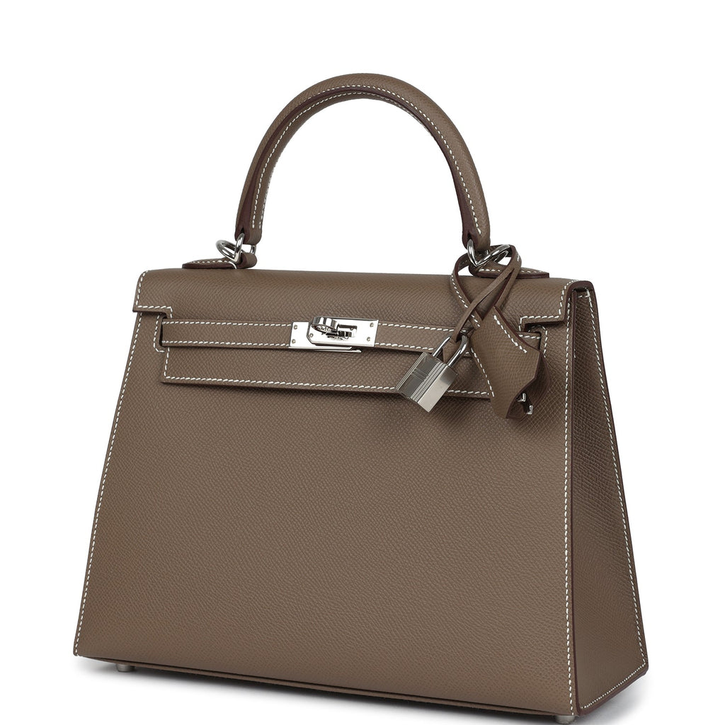 Pre-owned Hermes Kelly Sellier 25 Etoupe Epsom Palladium Hardware Shop for an authentic pre-owned Hermes Kelly Sellier 25 in Etoupe epsom leather with palladium hardware in mint condition at Madison Avenue Couture.