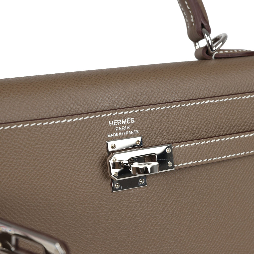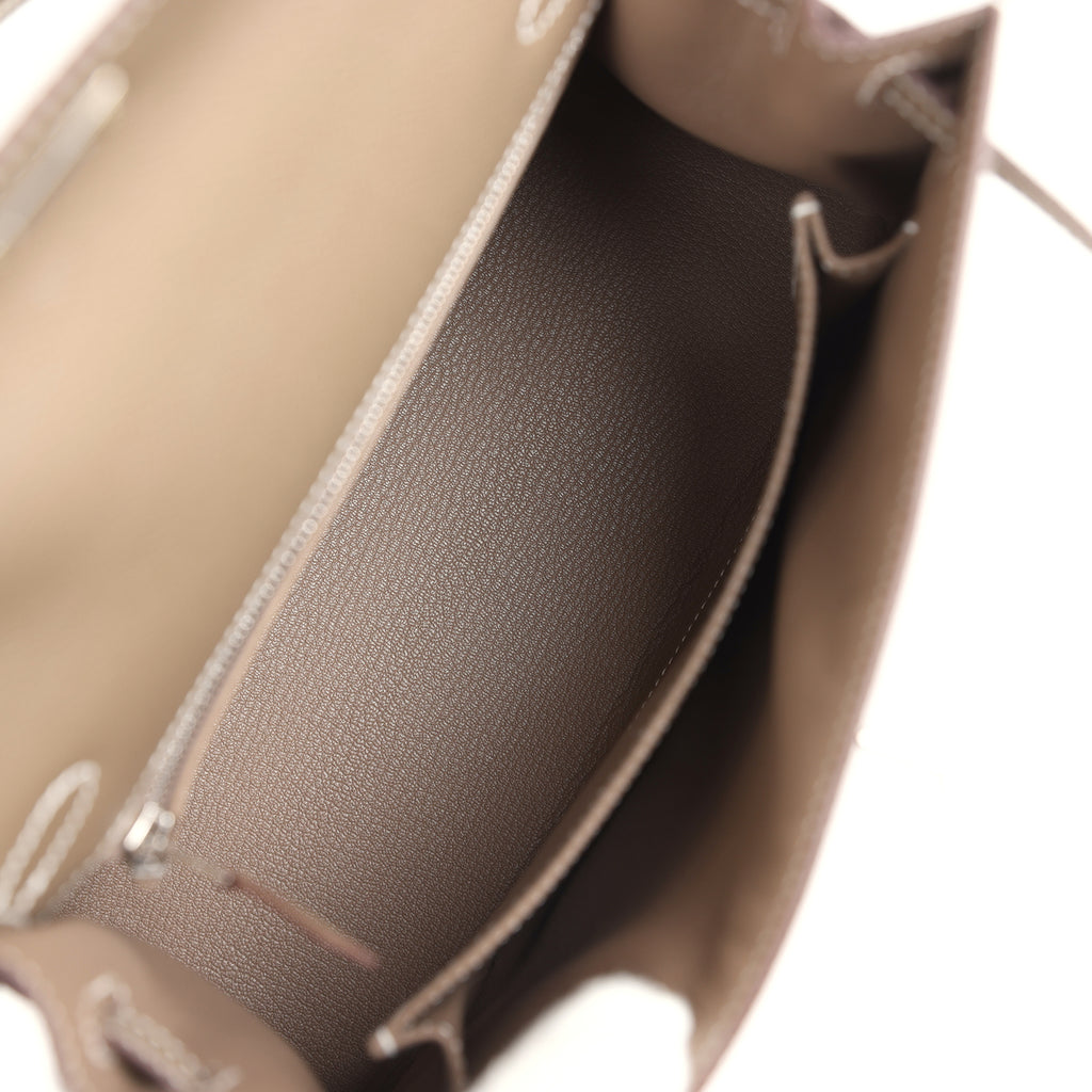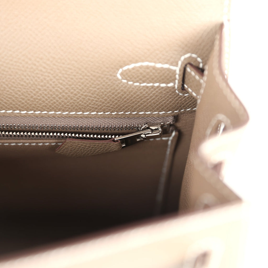 Pre-owned Hermes Kelly Sellier 25 Etoupe Epsom Palladium Hardware Shop for an authentic pre-owned Hermes Kelly Sellier 25 in Etoupe epsom leather with palladium hardware in mint condition at Madison Avenue Couture.