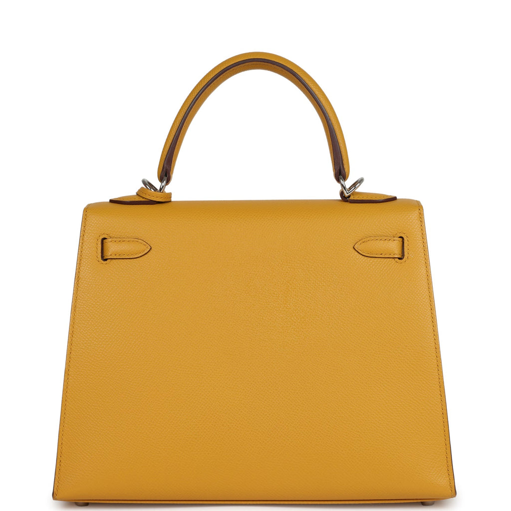 Pre-owned Hermes Kelly Sellier 25 Jaune Ambre Epsom Palladium Hardware Shop for an authentic pre-owned Hermes Kelly Sellier 25 in Jaune Ambre epsom leather with palladium hardware in excellent condition at Madison Avenue Couture.