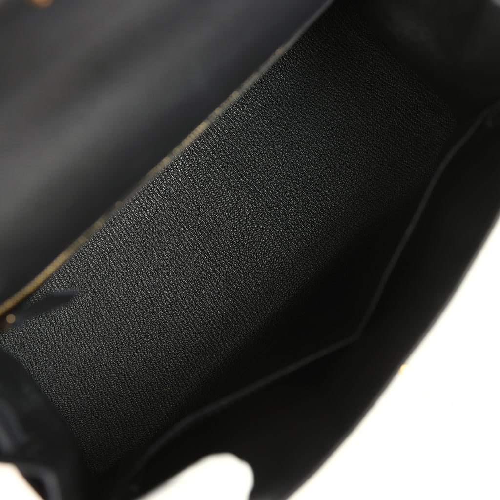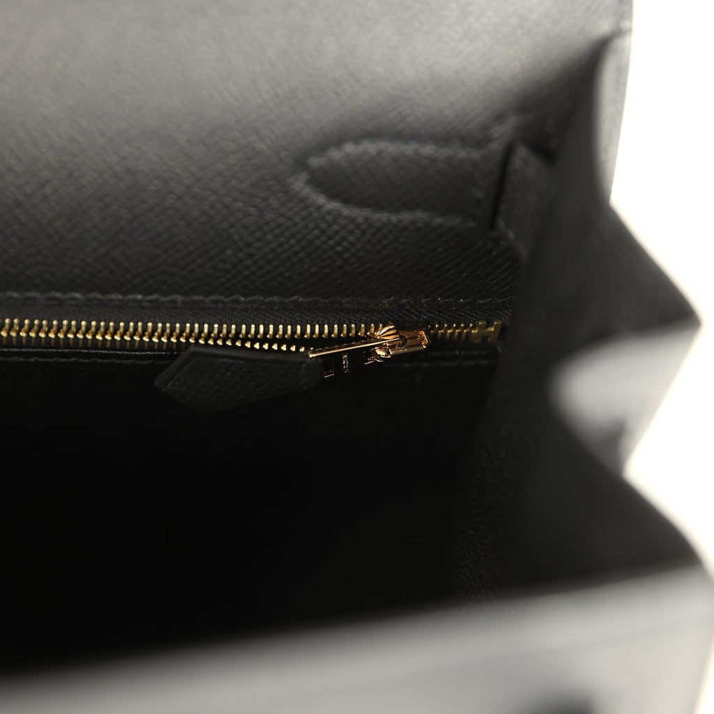 This Kelly, in the Sellier style, is in Black epsom leather with gold hardware and has tonal stitching, front flap, two straps with center toggle closure, clochette with lock and two keys, single rolled handle and removable shoulder strap.The interior is lined in Black chevre leather and has one zip pocket with Hermes engraved pull and two open pockets on the opposite side.Collection: W (2024)Origin: FranceCondition: Pre-owned; Mint – This bag retains its shape structure. The exterior leather is clean with no signs of wear or use. There is partial plastic on the bottom feet and on the turnlock plate. The rest of the exposed hardware including the shoulder strap have light hairline scratches. The interior leather is clean with no signs of wearAccompanied by: Hermes box, Hermes dustbag, felt, clochette, lock, two keys, shoulder strap, shoulder strap dustbag, clochette dustbag, carebook, ribbonMeasurements: 11.25″ width x 8.25″ height x 4.5″ depth; 3.5″ handle drop (16.5″ shoulder strap drop)