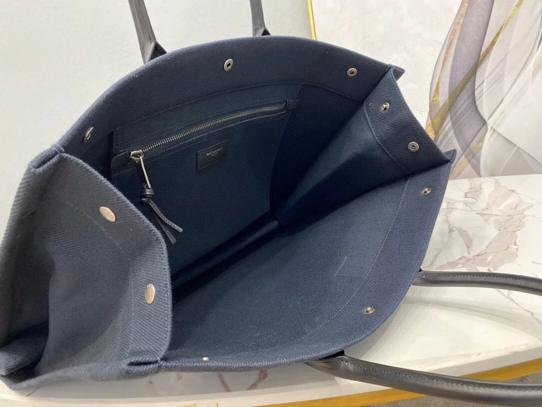 #RiveGaucheTote #CanvasChic #LuxuryFashion #ToteBagStyle #LeatherAccents #SpaciousDesign #FashionStatement #BronzeHardware #OrganizedElegance #EverydayLuxury