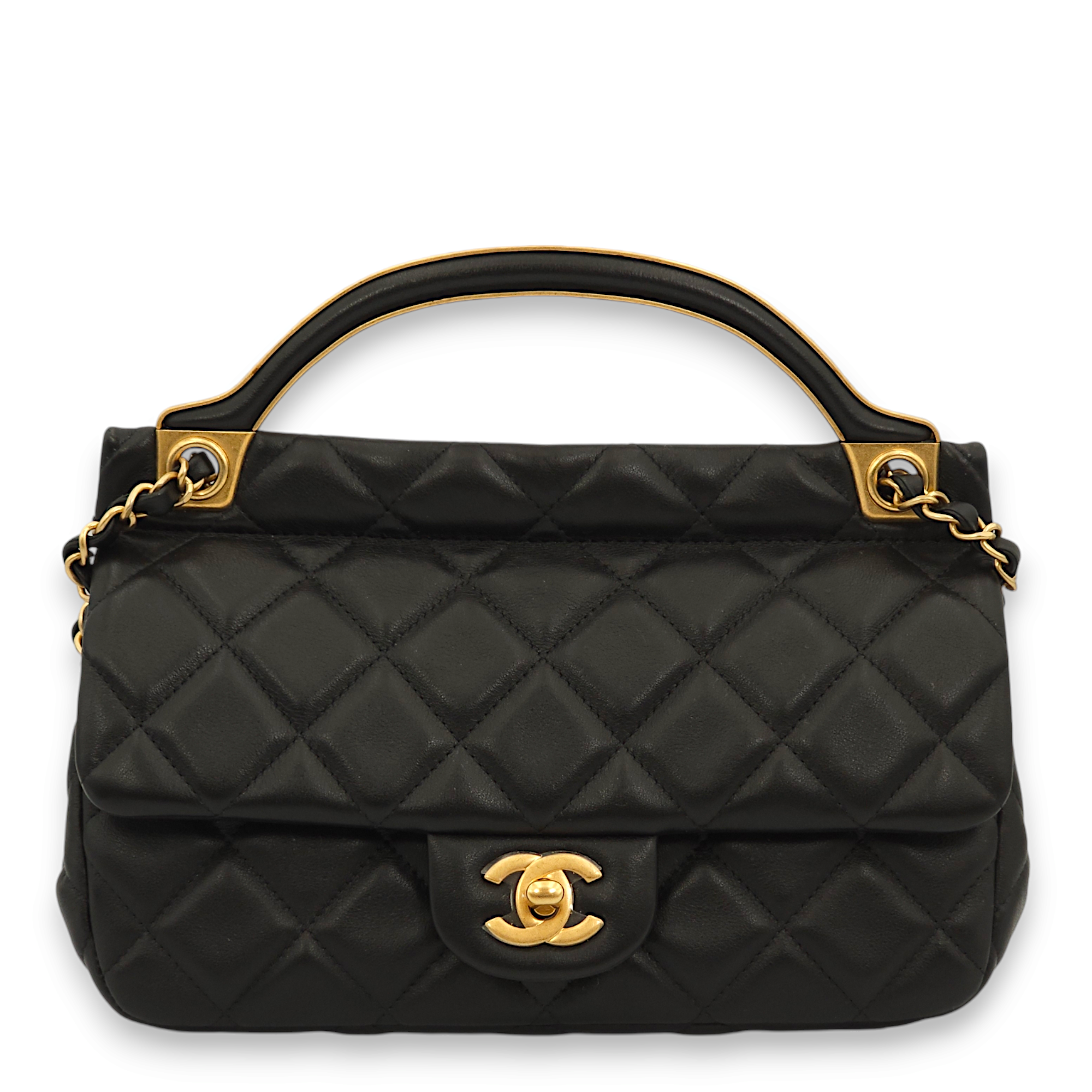 Seasonal Quilted Black Top Handle Bag in Lambskin, Gold hardware